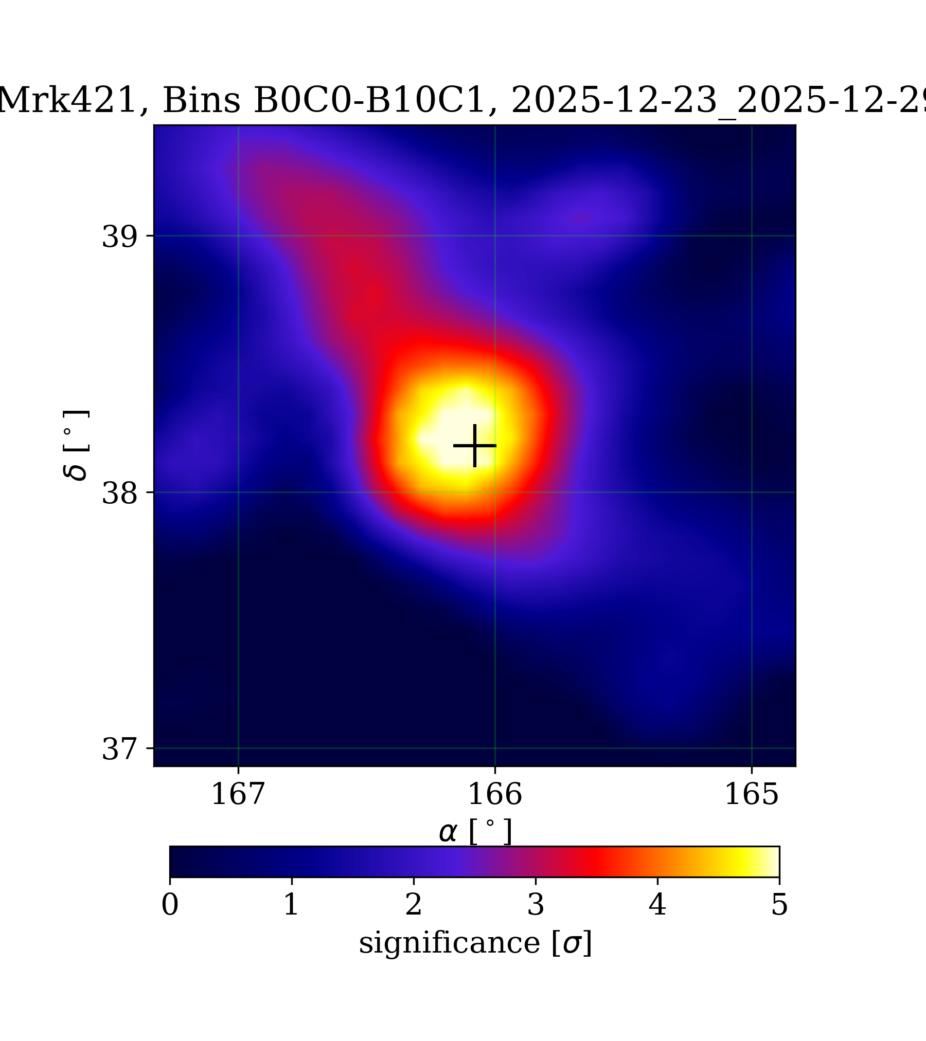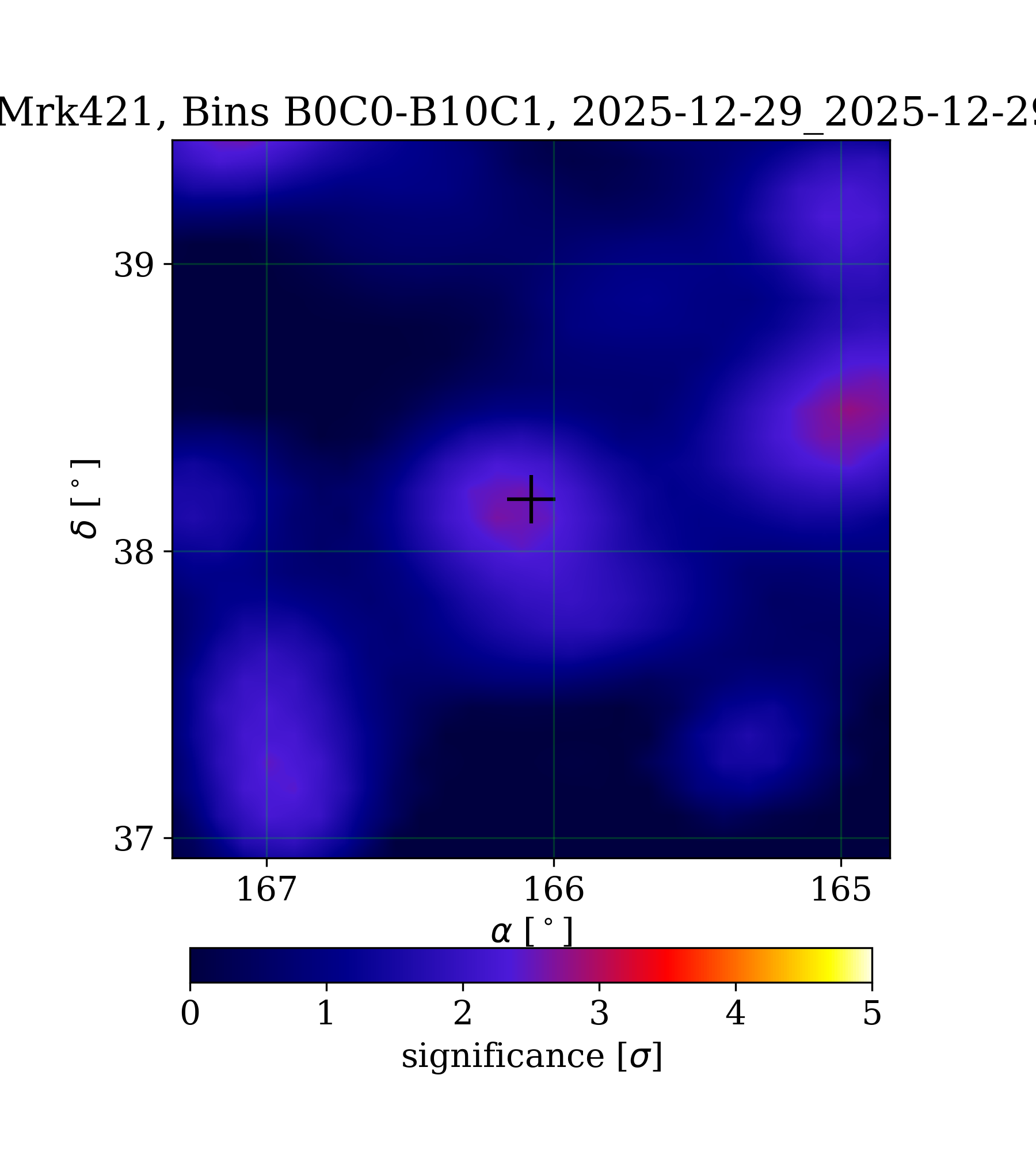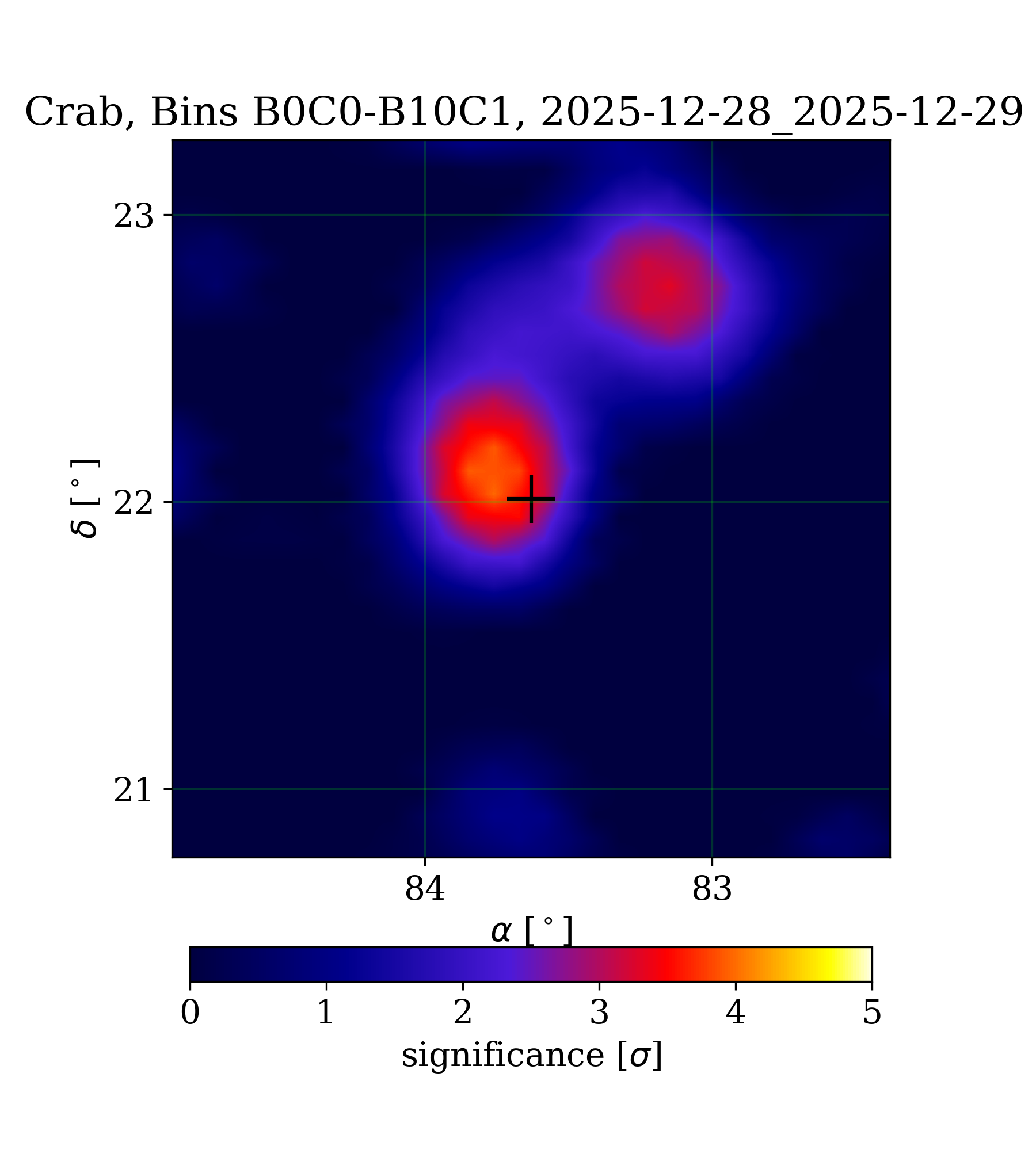 The following maps contain HAWC data from 1 transit of each source. There are two main sources of live time losses. First, each run restart introduces a ~5min gap in data-taking. Second, periods of 15min are excluded from analysis if an instability in the zenith distribution is detected. Usually the detector is stable and these cause only a few percent loss in live time but if this happens multiple times during the transit the integrated live time for that transit can decrease dramatically. The plot to the right shows the total integrated live time as a fraction of the source transit in some recent maps. Each point represents the total live time from the 1 transit period ending at the x-axis date. We expect real sources to be less significant for smaller live times. An integrated live time of 0 means HAWC was off during the source transit. This could be due to work on the detector, especially if the transit is in the morning when people are first getting to the site. Contact the #hawc-site channel in Slack to figure out what's up. These maps are made with a 9 bin LIFF analysis. The analysis does not include bin 0 because we have never seen a Crab signal in bin 0. The rest of the bins are identical to bins 1-9 in offline maps produced by Colas for the Saucy Platypus/Pass 4 reconstruction. There is no separation of ON/OFF detector events. We use the same detector response file as defined offline for Pass 4. Click here to learn more about online map production. Click here to visit the archive of all past map images. |