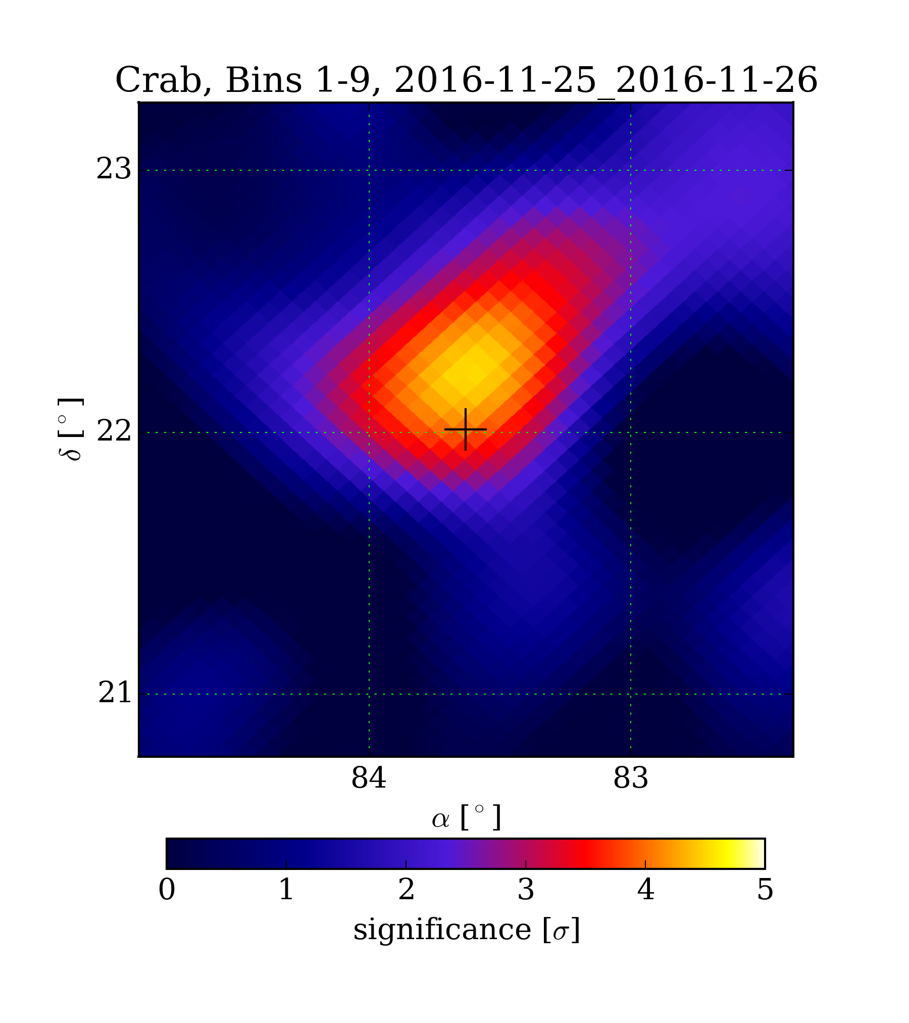 | Min: | -1.61 | ( 84.91 deg, 21.90 deg) | | Max: | 4.53 | ( 83.59 deg, 22.22 deg) | | Significance at Crab: | 4.03 | (at Crab) |