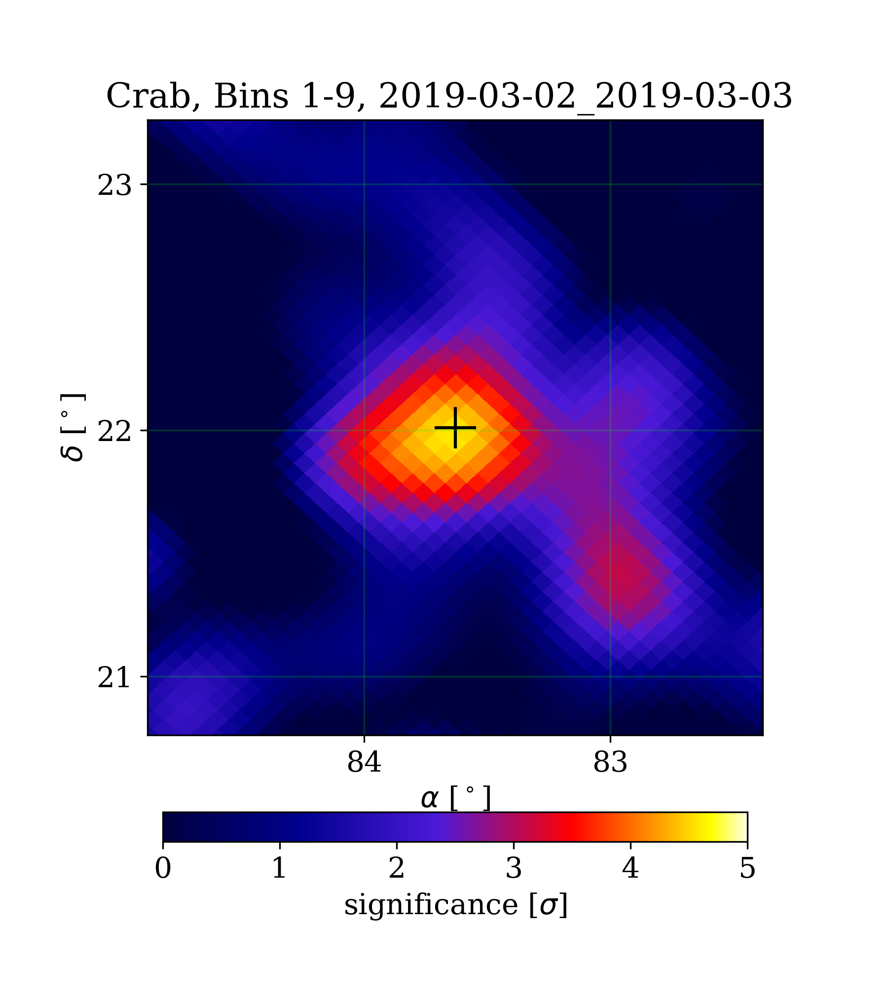 | Min: | -3.56 | ( 84.90 deg, 22.71 deg) | | Max: | 4.58 | ( 83.63 deg, 21.94 deg) | | Significance at Crab: | 4.55 | (at Crab) |