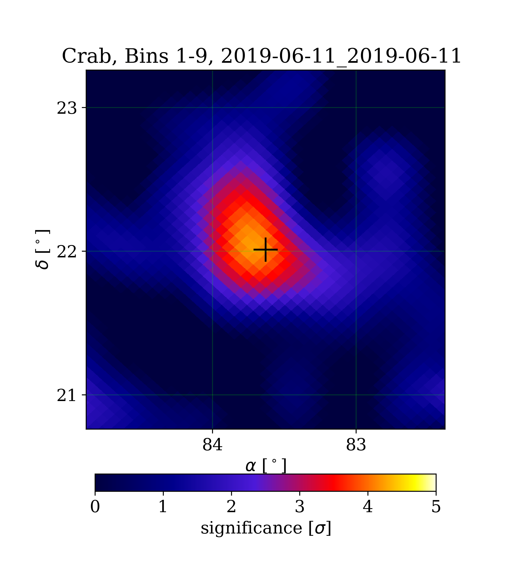 | Min: | -2.88 | ( 82.53 deg, 23.28 deg) | | Max: | 4.22 | ( 83.72 deg, 22.02 deg) | | Significance at Crab: | 4.10 | (at Crab) |