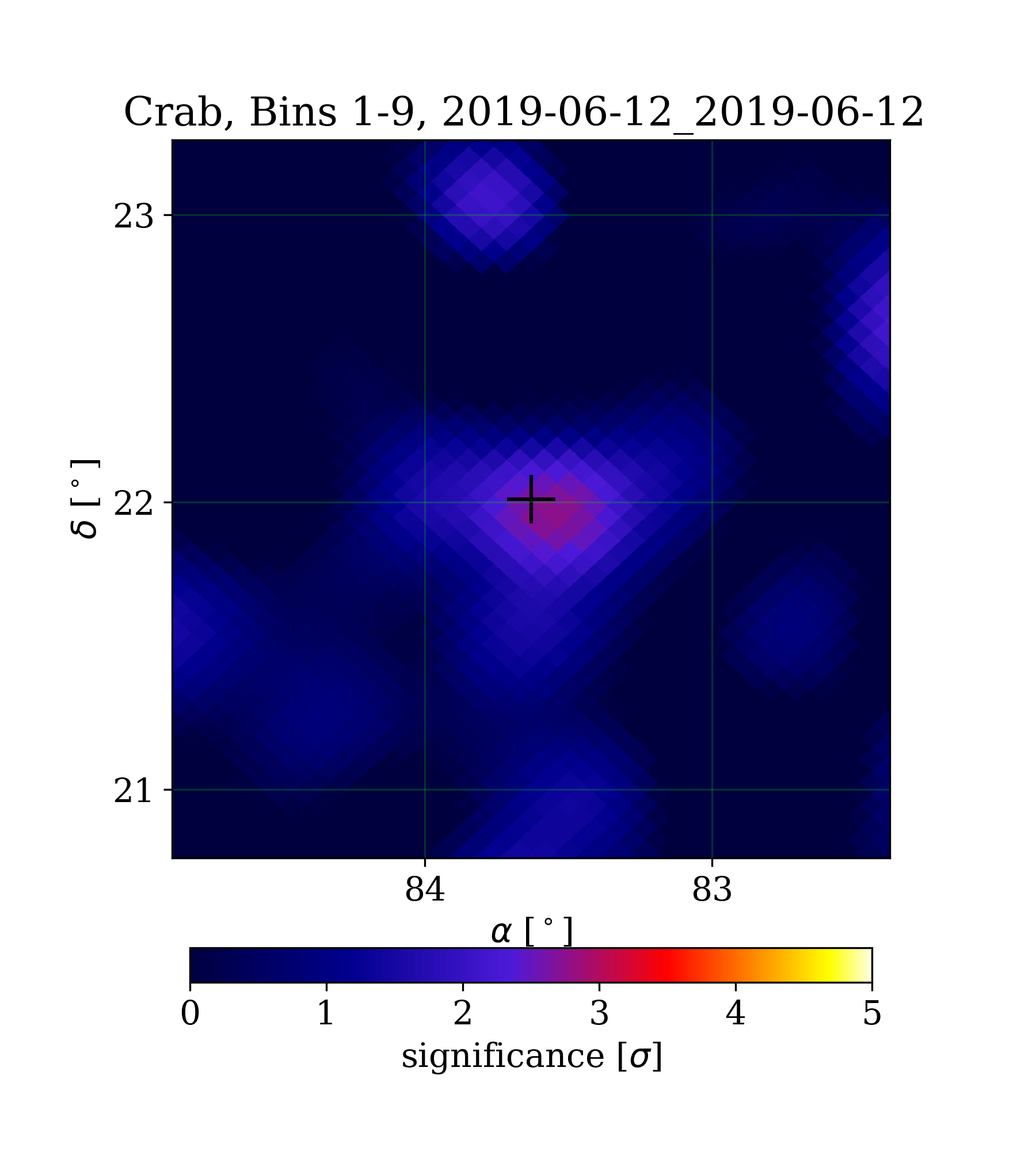 | Min: | -2.38 | ( 84.64 deg, 23.28 deg) | | Max: | 2.76 | ( 83.54 deg, 21.94 deg) | | Significance at Crab: | 2.62 | (at Crab) |