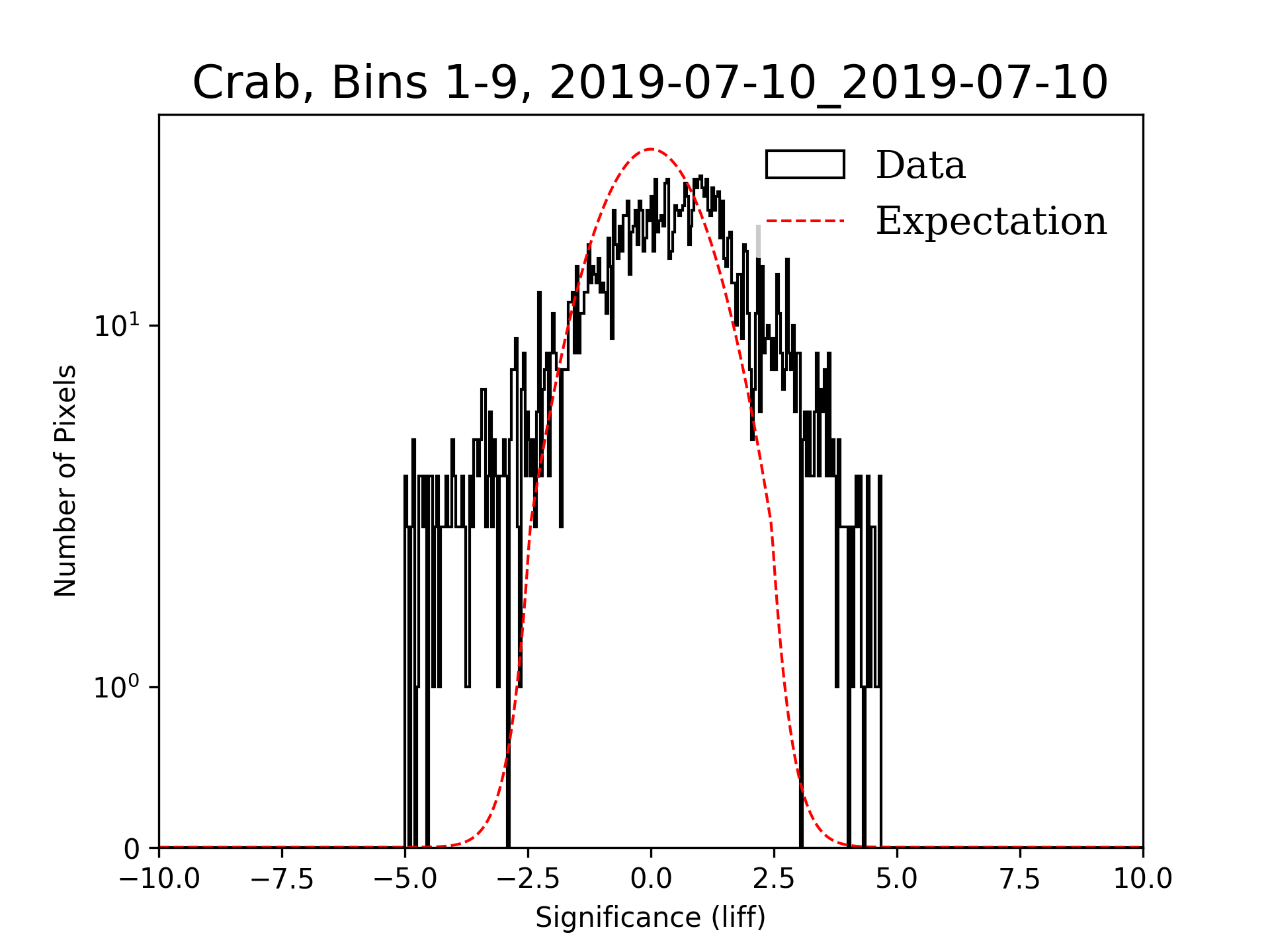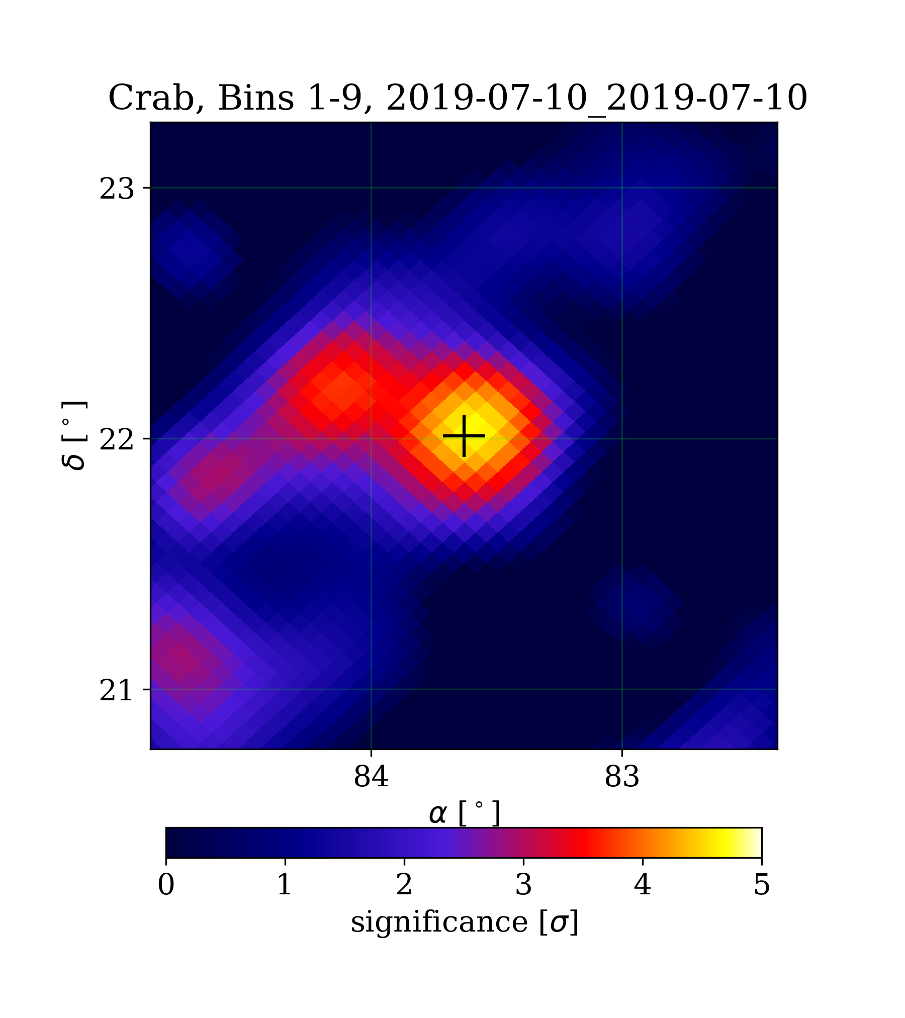 | Min: | -4.99 | ( 82.49 deg, 21.86 deg) | | Max: | 4.68 | ( 83.63 deg, 22.02 deg) | | Significance at Crab: | 4.68 | (at Crab) |