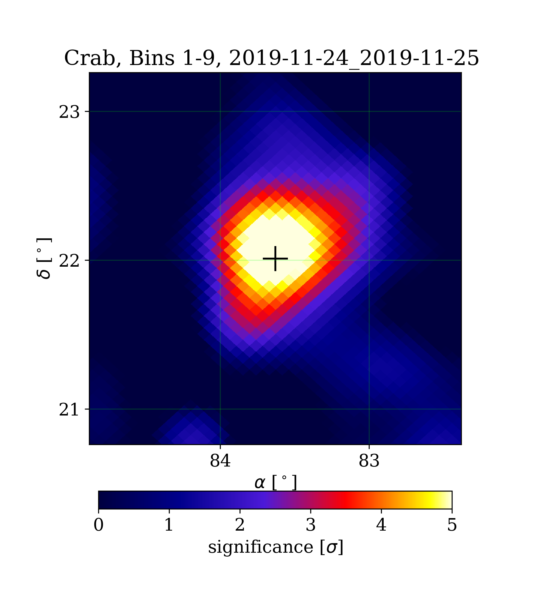 | Min: | -2.41 | ( 82.35 deg, 23.12 deg) | | Max: | 6.03 | ( 83.63 deg, 22.10 deg) | | Significance at Crab: | 6.01 | (at Crab) |
