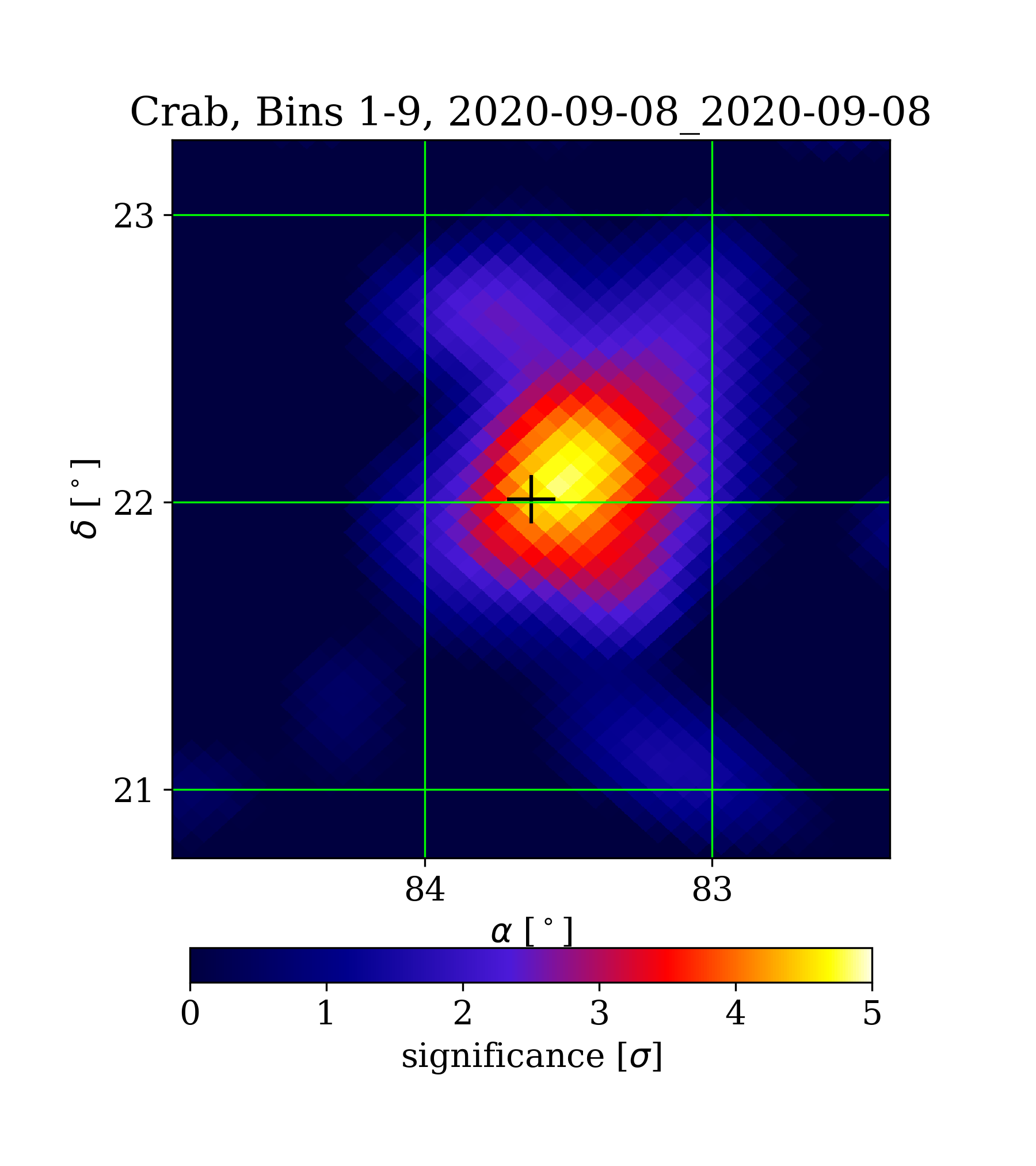 | Min: | -1.74 | ( 83.50 deg, 20.73 deg) | | Max: | 4.84 | ( 83.54 deg, 22.05 deg) | | Significance at Crab: | 4.28 | (at Crab) |