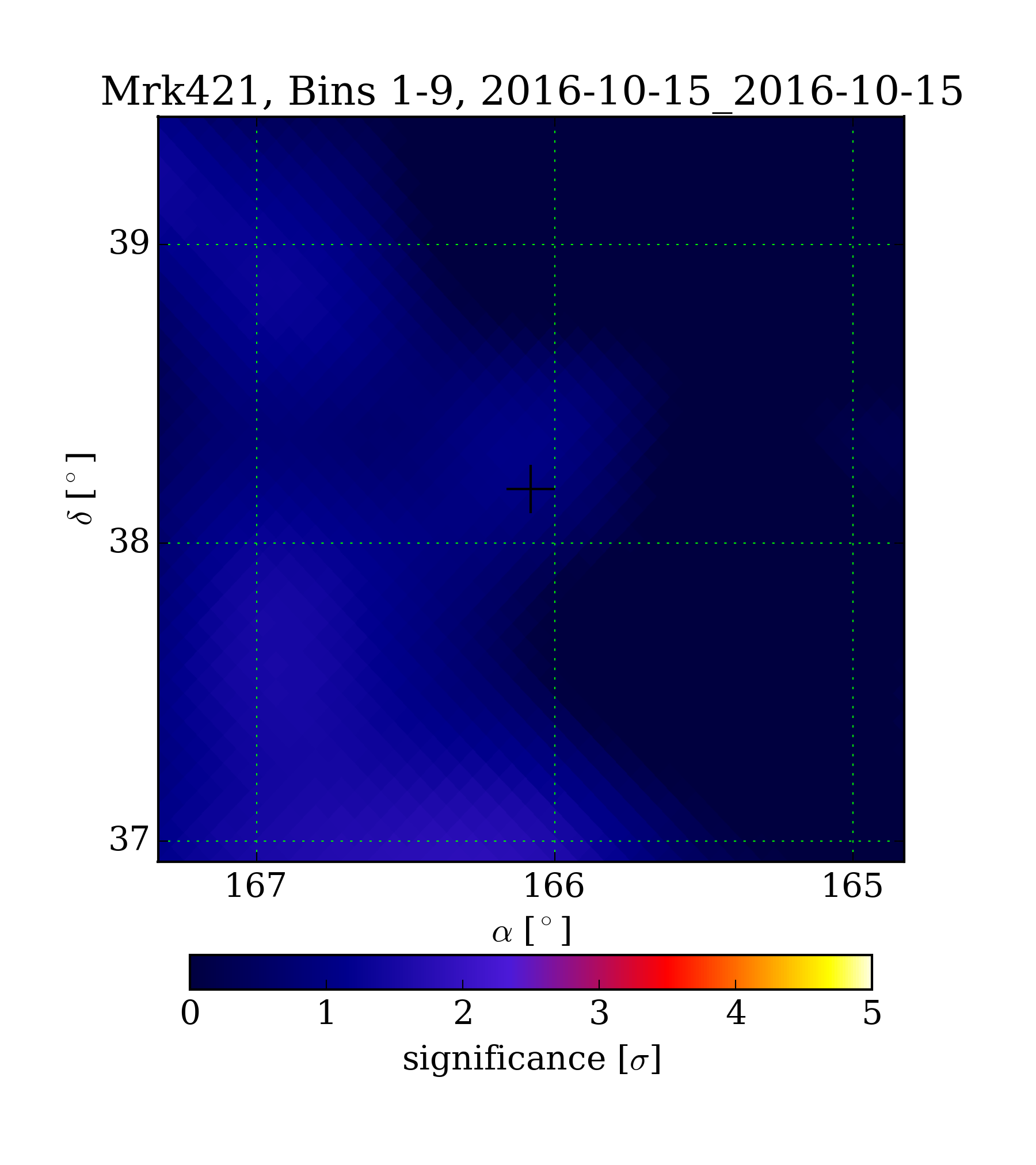 | Min: | -2.14 | (165.09 deg, 39.01 deg) | | Max: | 1.85 | (166.32 deg, 36.93 deg) | | Significance at Mrk421: | 1.01 | (at Mrk421) |