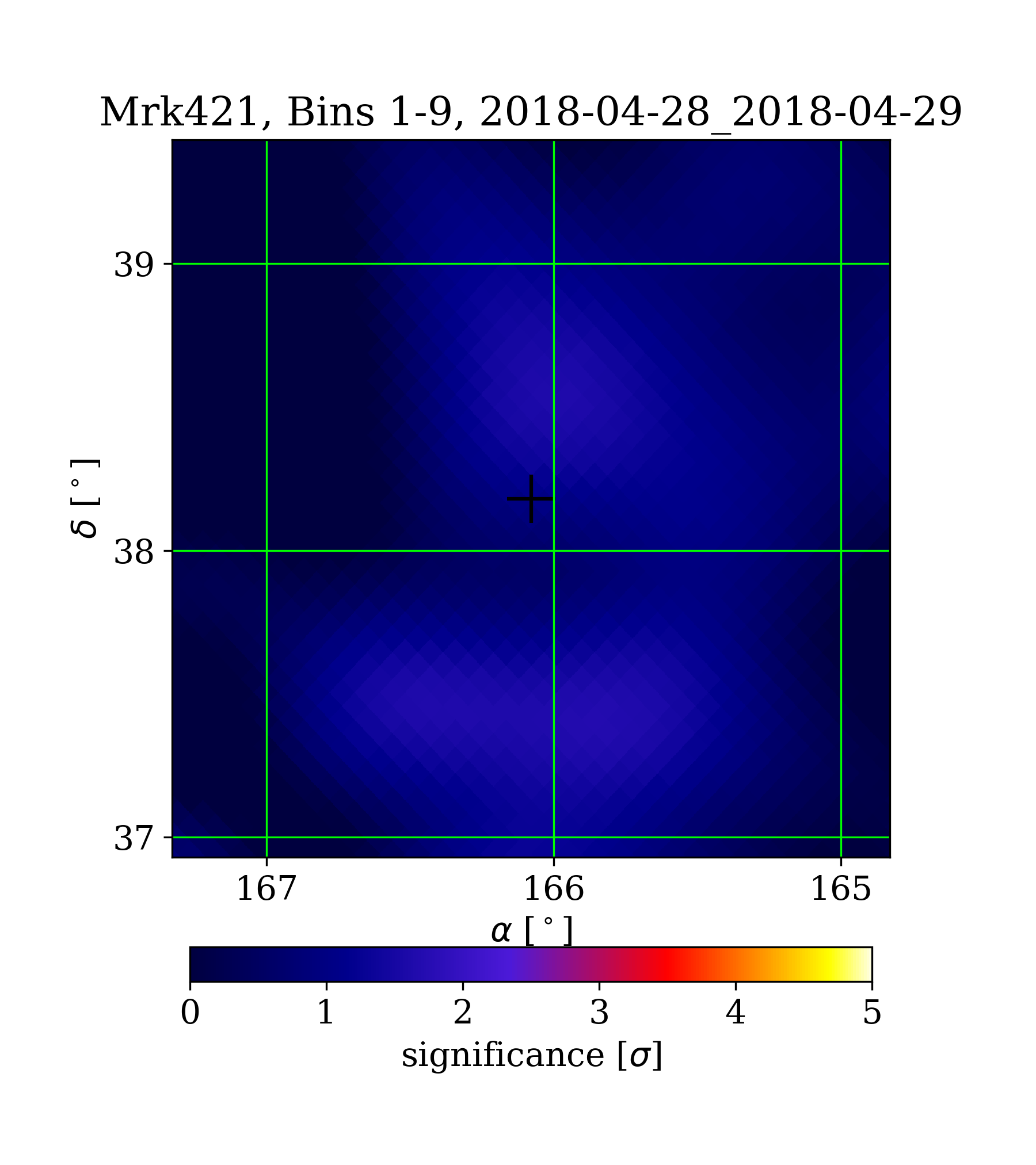 | Min: | -2.10 | (167.35 deg, 39.41 deg) | | Max: | 1.72 | (165.86 deg, 37.41 deg) | | Significance at Mrk421: | 1.13 | (at Mrk421) |