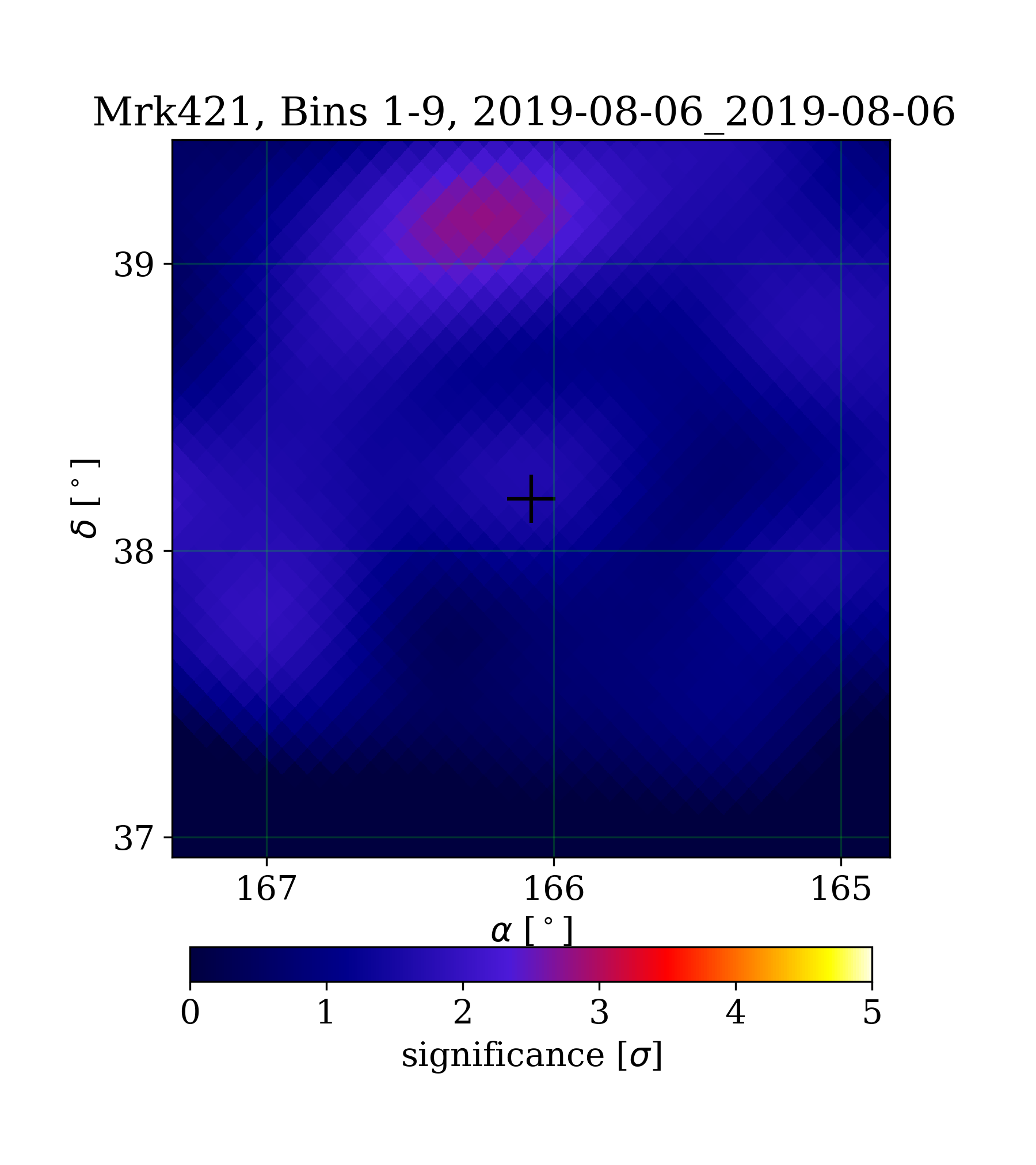 | Min: | -1.83 | (167.34 deg, 37.12 deg) | | Max: | 2.80 | (166.25 deg, 39.16 deg) | | Significance at Mrk421: | 1.66 | (at Mrk421) |