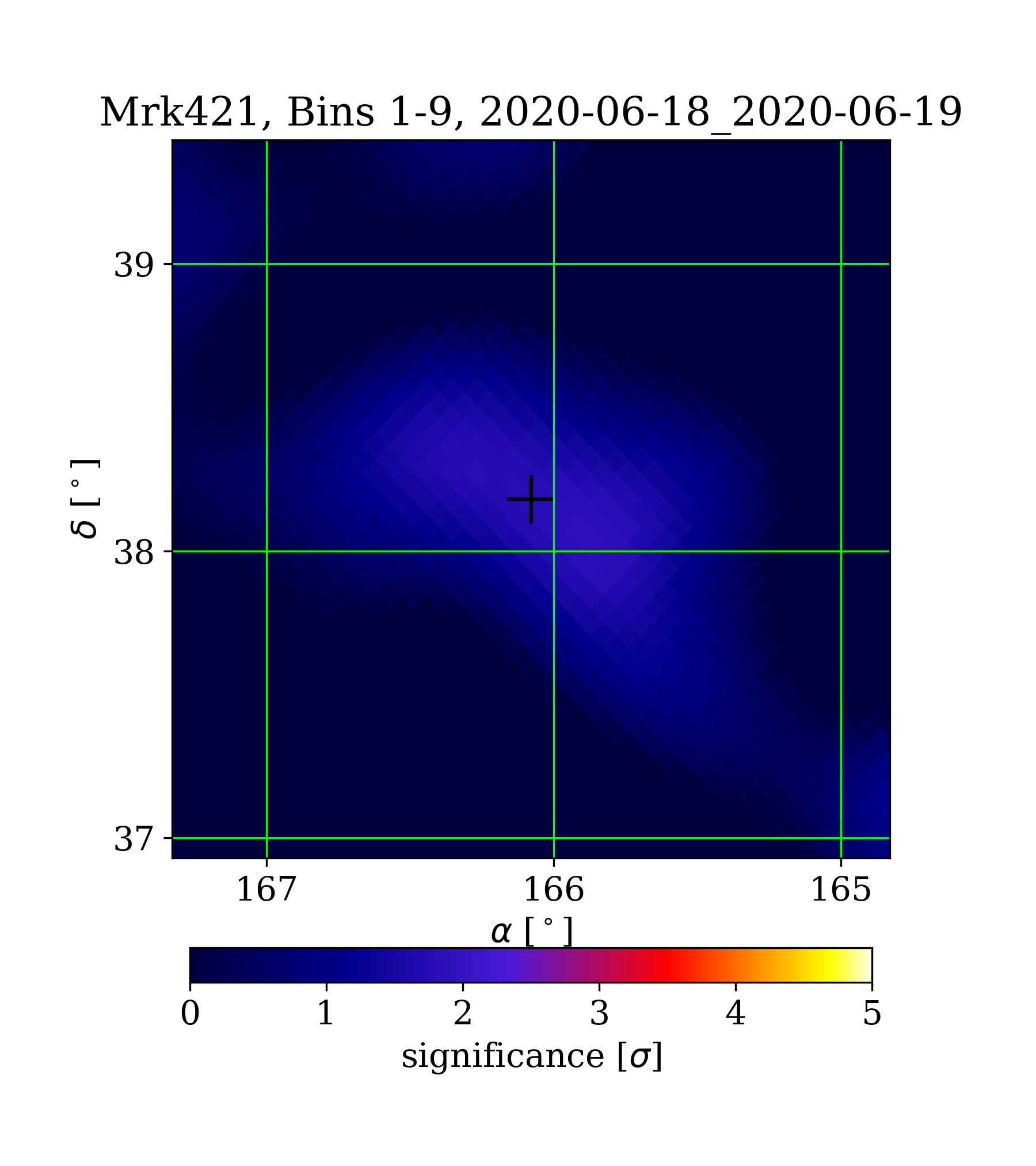| Min: | -2.03 | (165.26 deg, 39.46 deg) | | Max: | 1.89 | (165.92 deg, 38.08 deg) | | Significance at Mrk421: | 1.80 | (at Mrk421) |