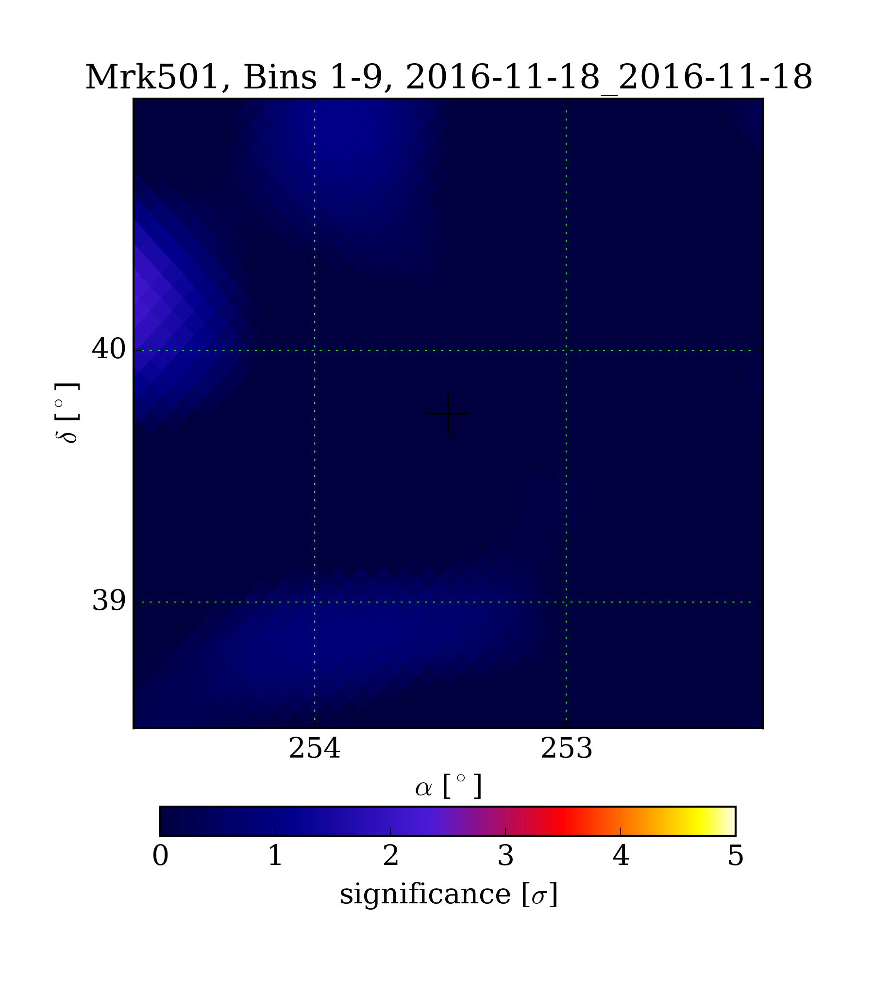 | Min: | -1.87 | (254.43 deg, 39.38 deg) | | Max: | 2.29 | (254.74 deg, 40.20 deg) | | Significance at Mrk501: | -0.28 | (at Mrk501) |