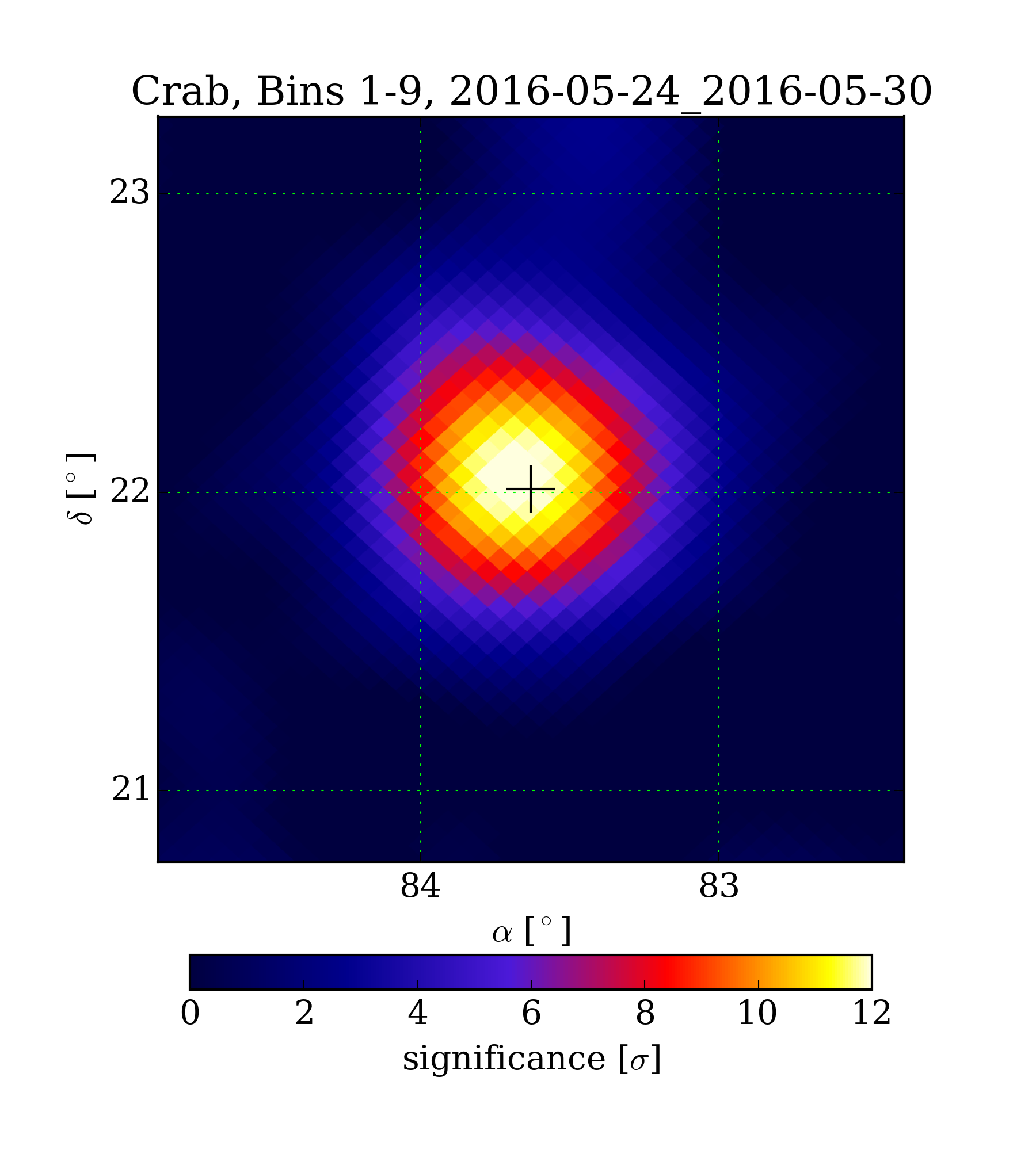 | Min: | -1.96 | ( 82.54 deg, 23.10 deg) | | Max: | 12.46 | ( 83.69 deg, 22.05 deg) | | Significance at Crab: | 12.33 | (at Crab) |
