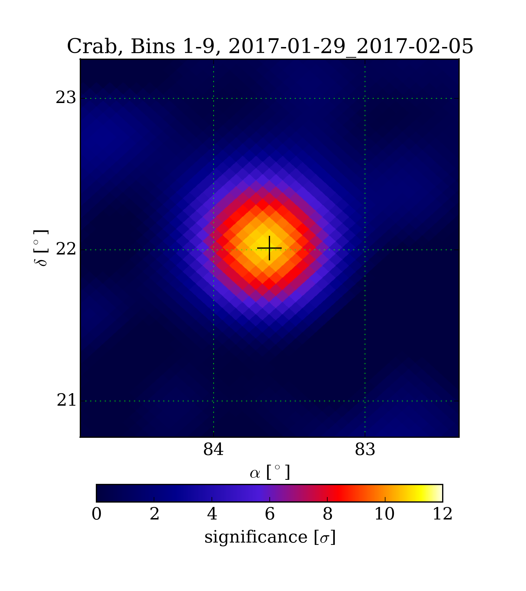 | Min: | -2.21 | ( 82.80 deg, 21.65 deg) | | Max: | 10.92 | ( 83.63 deg, 22.01 deg) | | Significance at Crab: | 10.92 | (at Crab) |