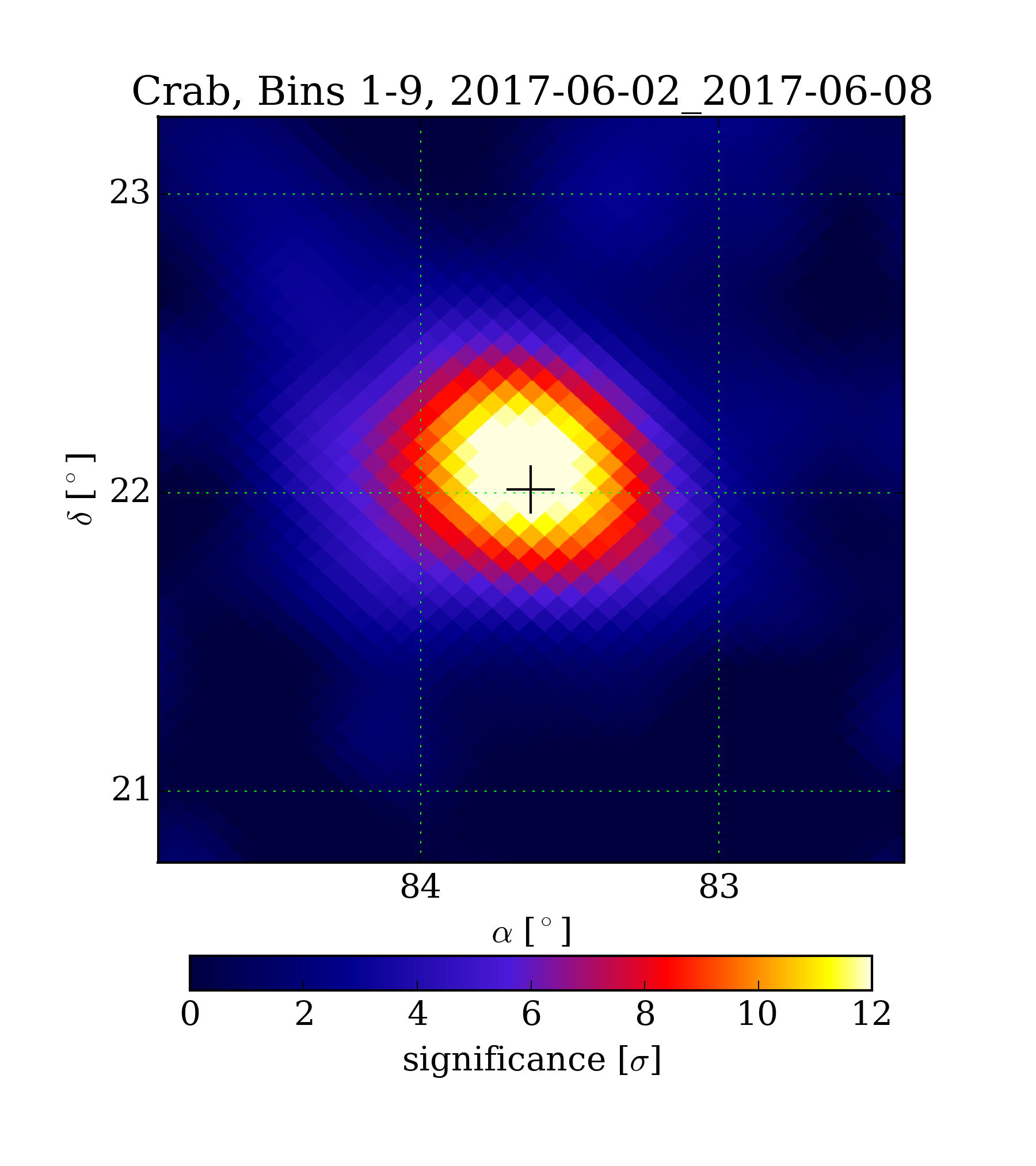 | Min: | -2.06 | ( 82.93 deg, 21.13 deg) | | Max: | 13.49 | ( 83.63 deg, 22.09 deg) | | Significance at Crab: | 13.19 | (at Crab) |
