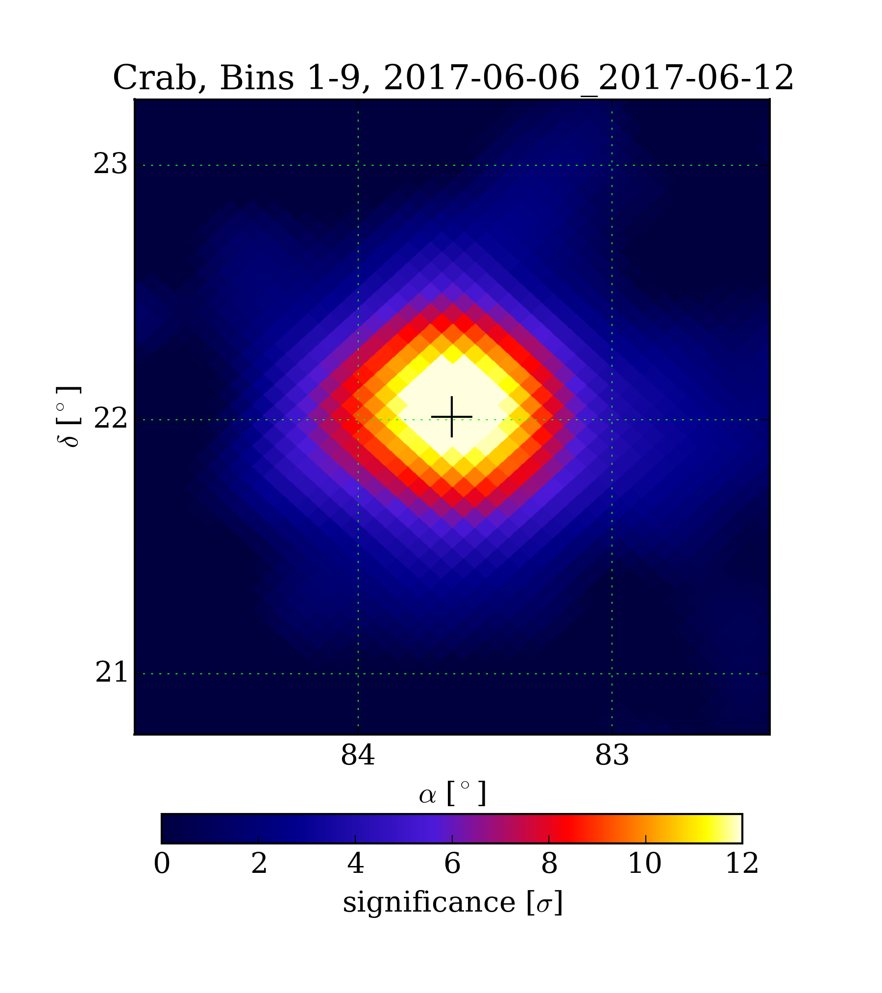 | Min: | -2.26 | ( 83.89 deg, 23.23 deg) | | Max: | 13.69 | ( 83.59 deg, 22.05 deg) | | Significance at Crab: | 13.64 | (at Crab) |