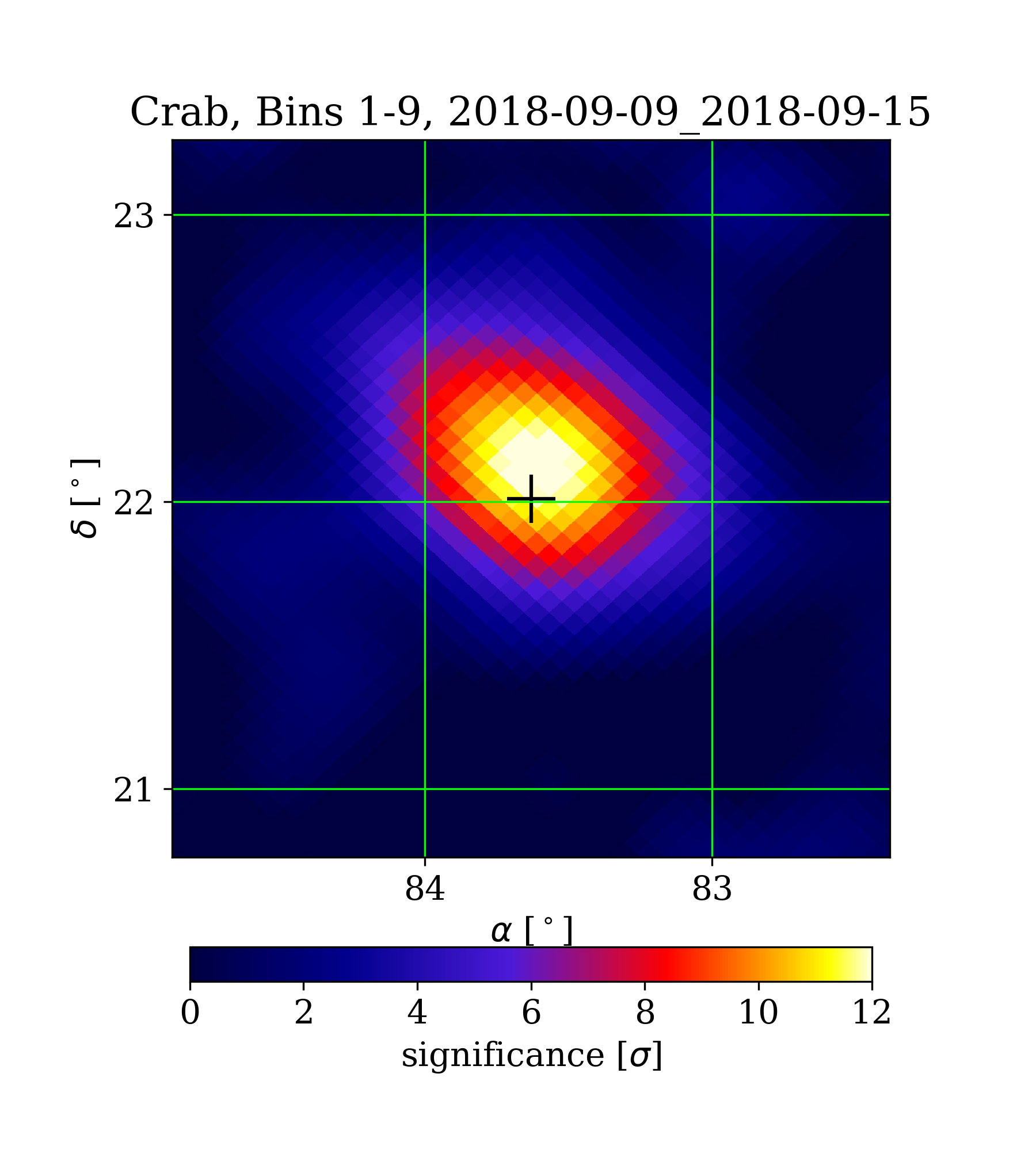 | Min: | -2.41 | ( 83.79 deg, 20.81 deg) | | Max: | 12.50 | ( 83.61 deg, 22.09 deg) | | Significance at Crab: | 11.86 | (at Crab) |