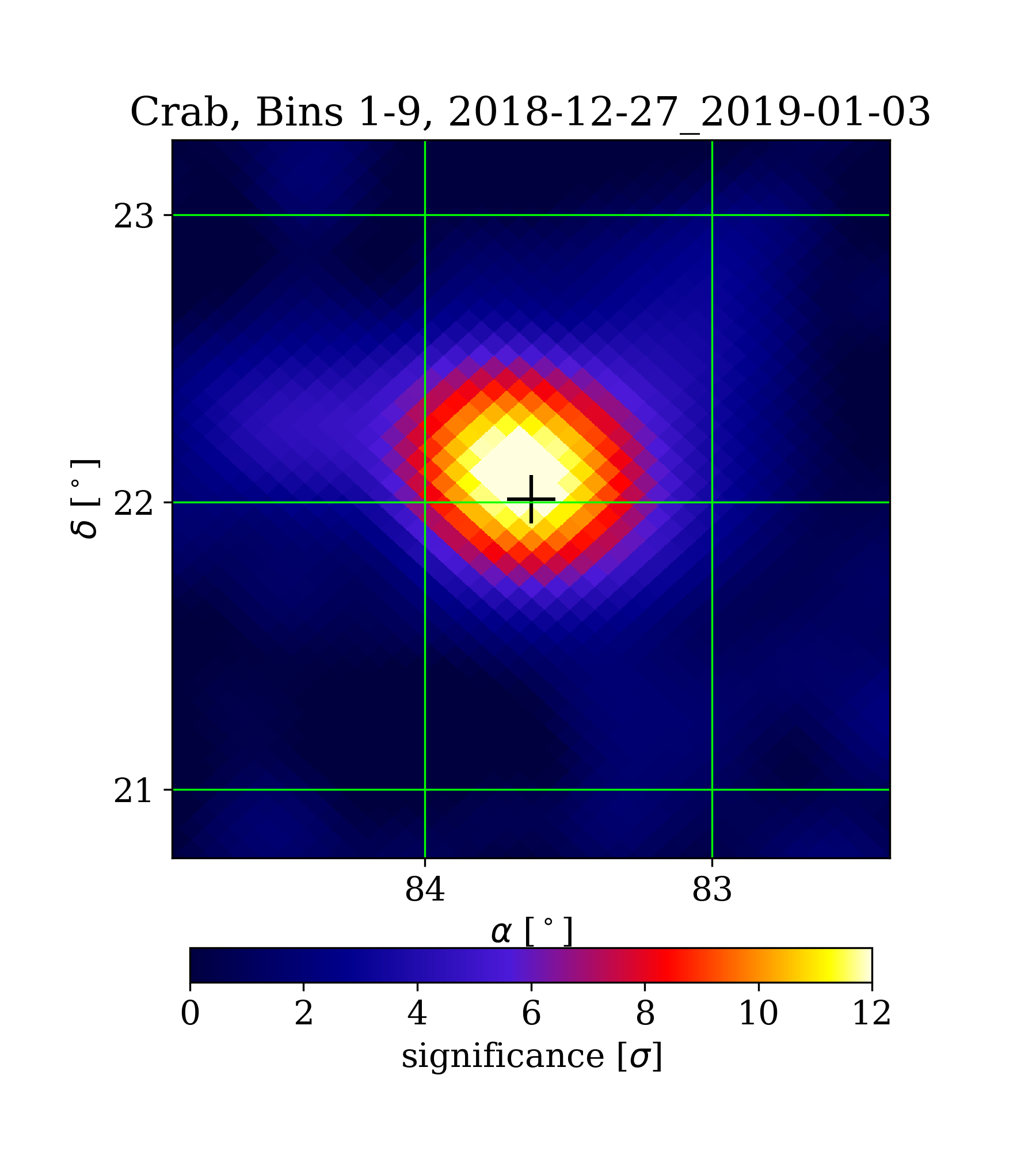 | Min: | 0.00 | ( 82.35 deg, 23.28 deg) | | Max: | 12.97 | ( 83.67 deg, 22.06 deg) | | Significance at Crab: | 12.68 | (at Crab) |
