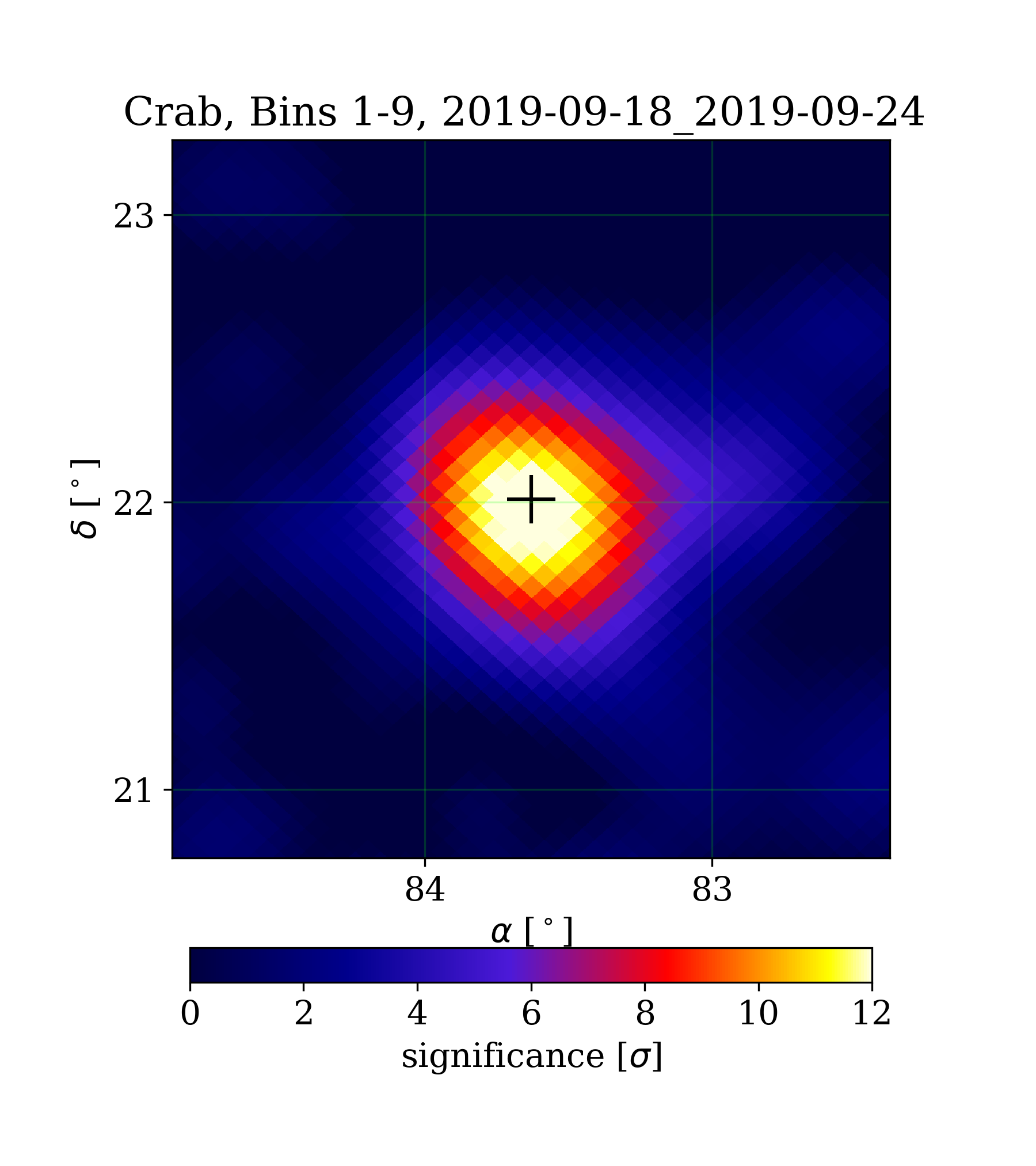 | Min: | -2.58 | ( 82.57 deg, 23.16 deg) | | Max: | 12.97 | ( 83.63 deg, 21.94 deg) | | Significance at Crab: | 12.85 | (at Crab) |