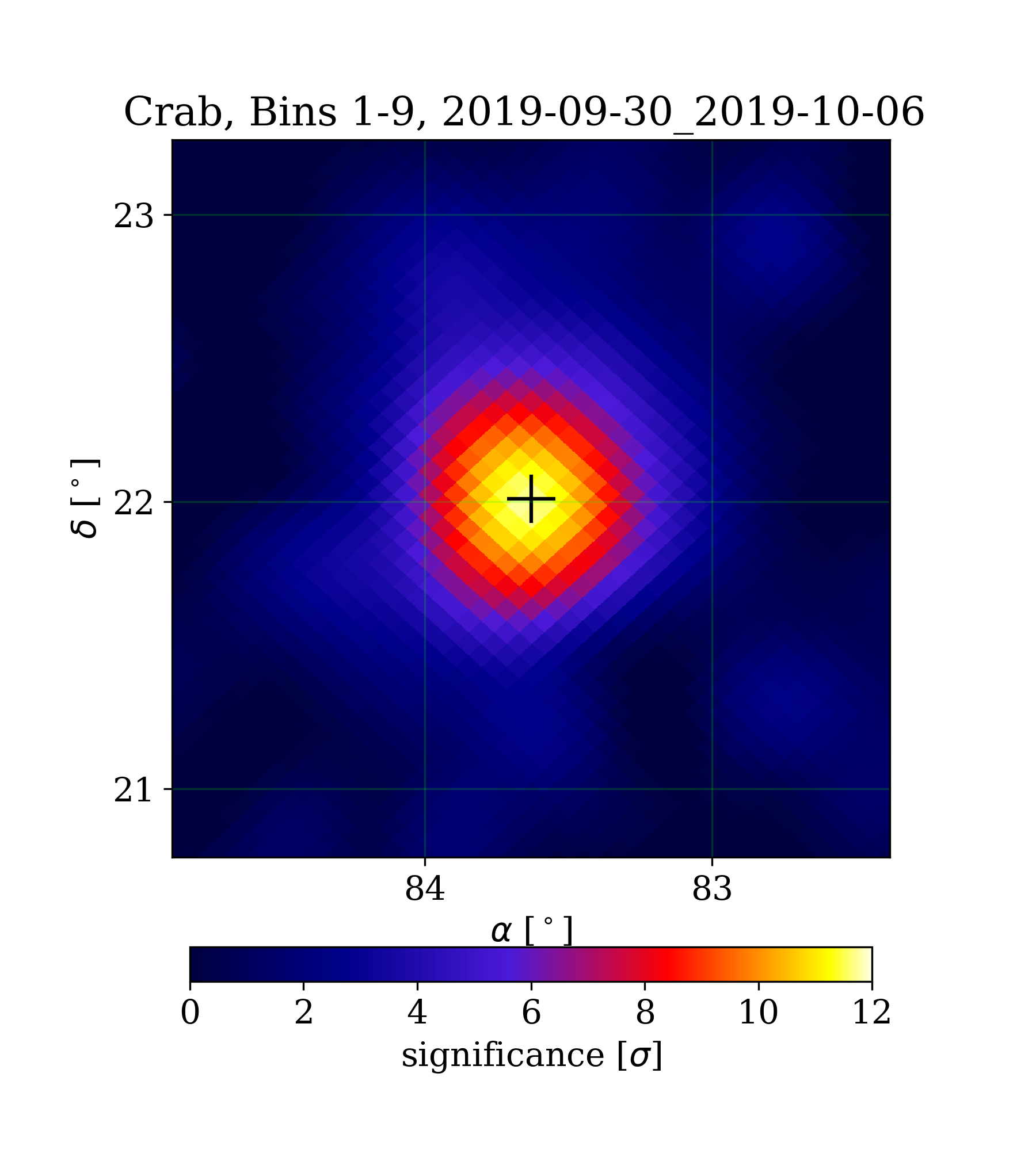 | Min: | -2.83 | ( 84.77 deg, 22.99 deg) | | Max: | 11.72 | ( 83.67 deg, 21.98 deg) | | Significance at Crab: | 11.71 | (at Crab) |