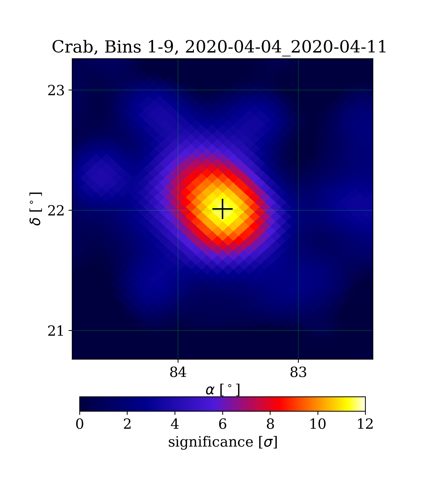 | Min: | -3.71 | ( 83.19 deg, 20.74 deg) | | Max: | 11.63 | ( 83.63 deg, 22.02 deg) | | Significance at Crab: | 11.63 | (at Crab) |