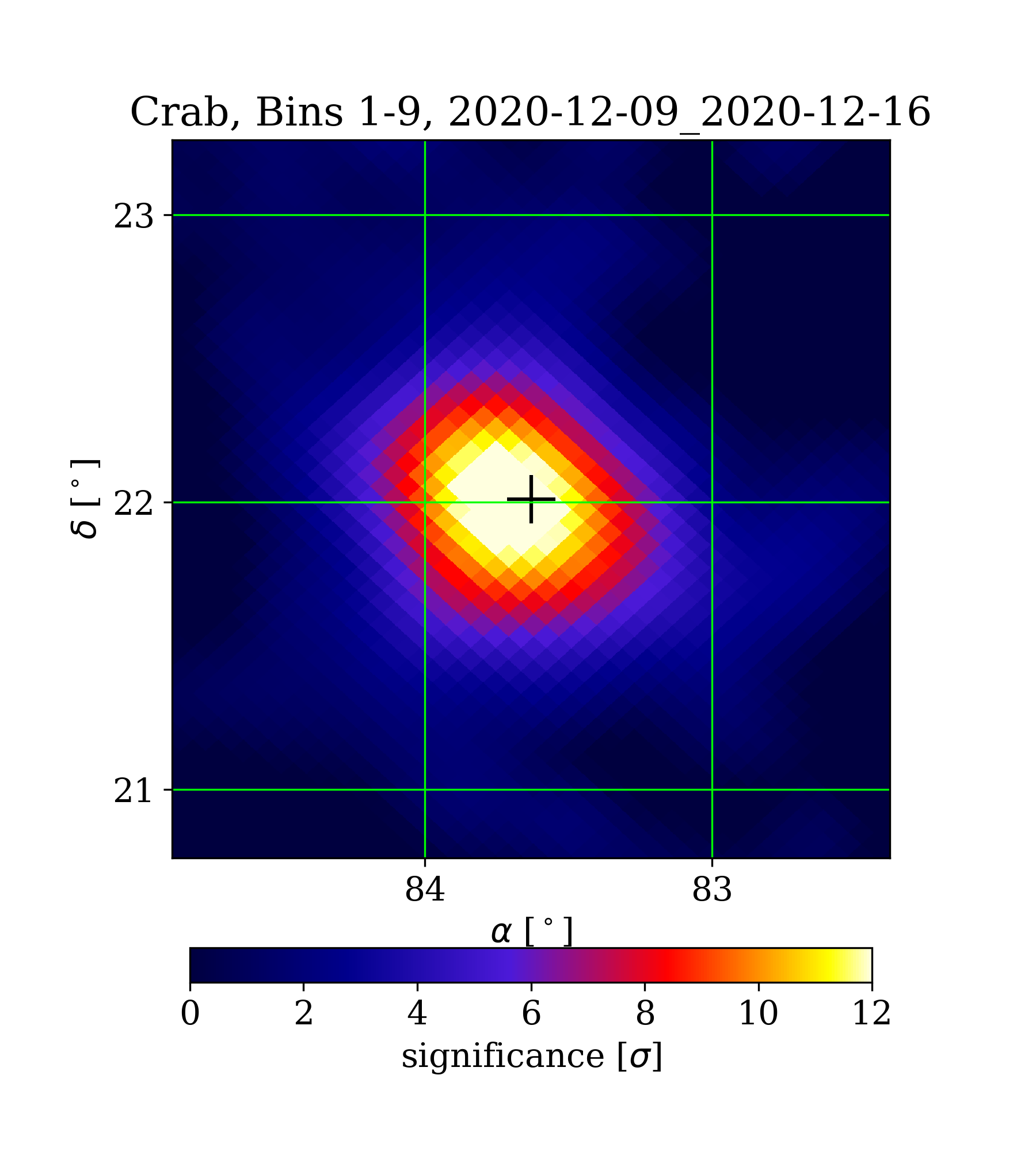 | Min: | -2.67 | ( 82.52 deg, 22.82 deg) | | Max: | 13.51 | ( 83.71 deg, 21.97 deg) | | Significance at Crab: | 13.43 | (at Crab) |