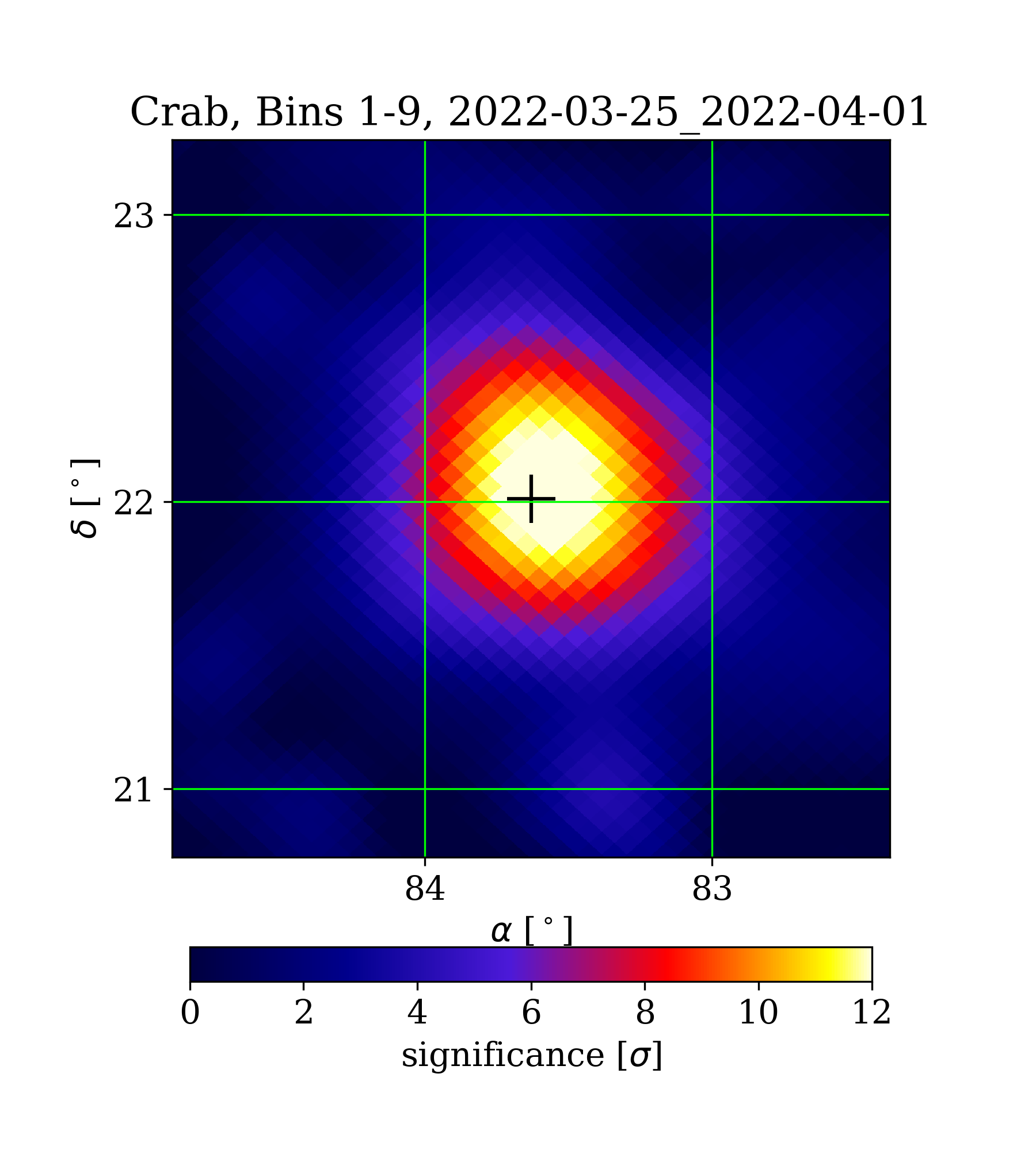 | Min: | -1.23 | ( 84.92 deg, 22.13 deg) | | Max: | 13.32 | ( 83.60 deg, 22.05 deg) | | Significance at Crab: | 13.12 | (at Crab) |