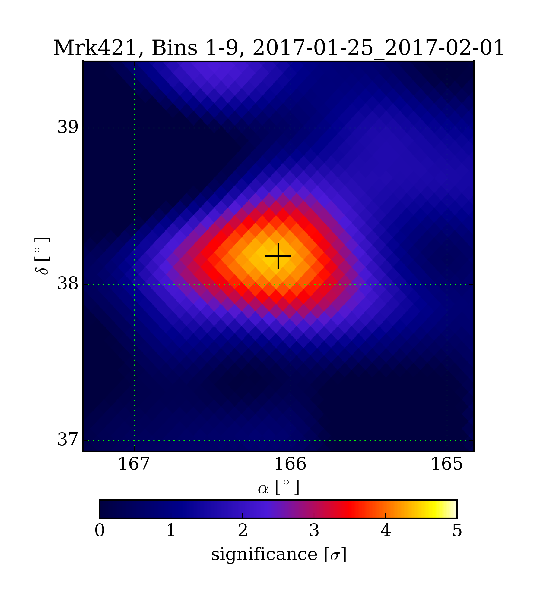 | Min: | -2.66 | (167.20 deg, 38.82 deg) | | Max: | 4.46 | (166.14 deg, 38.16 deg) | | Significance at Mrk421: | 4.43 | (at Mrk421) |