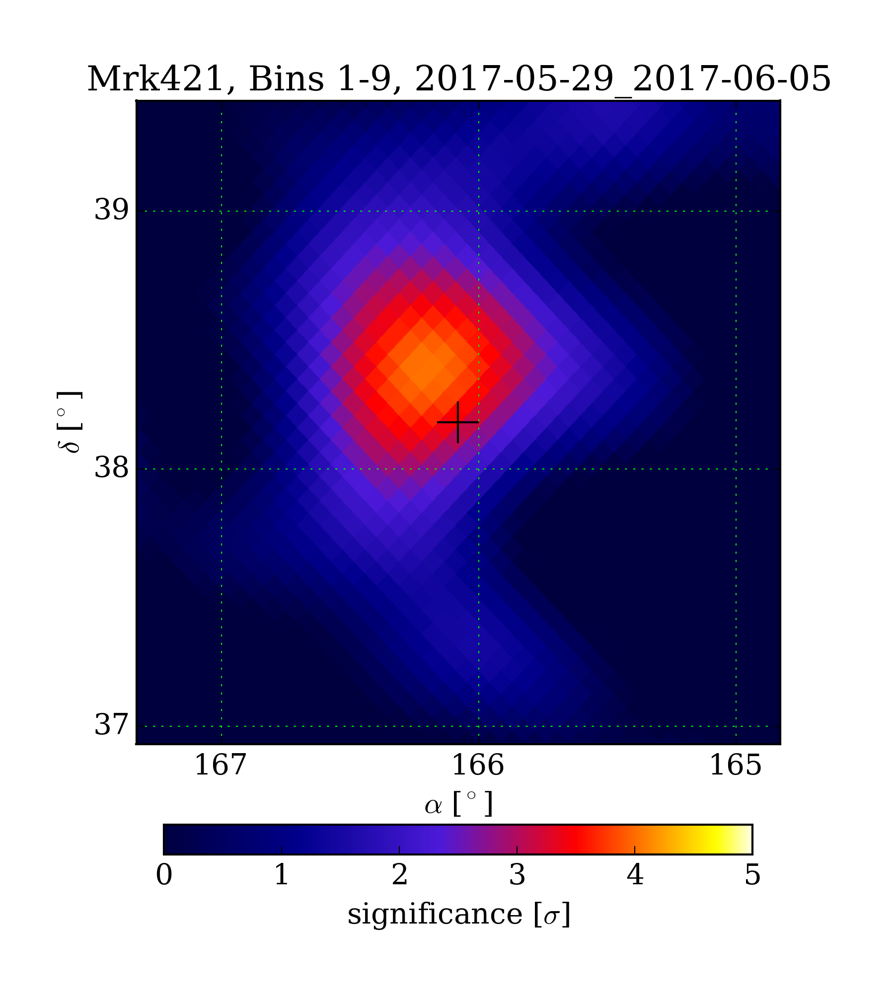 | Min: | -1.66 | (164.82 deg, 38.44 deg) | | Max: | 4.04 | (166.22 deg, 38.35 deg) | | Significance at Mrk421: | 3.50 | (at Mrk421) |