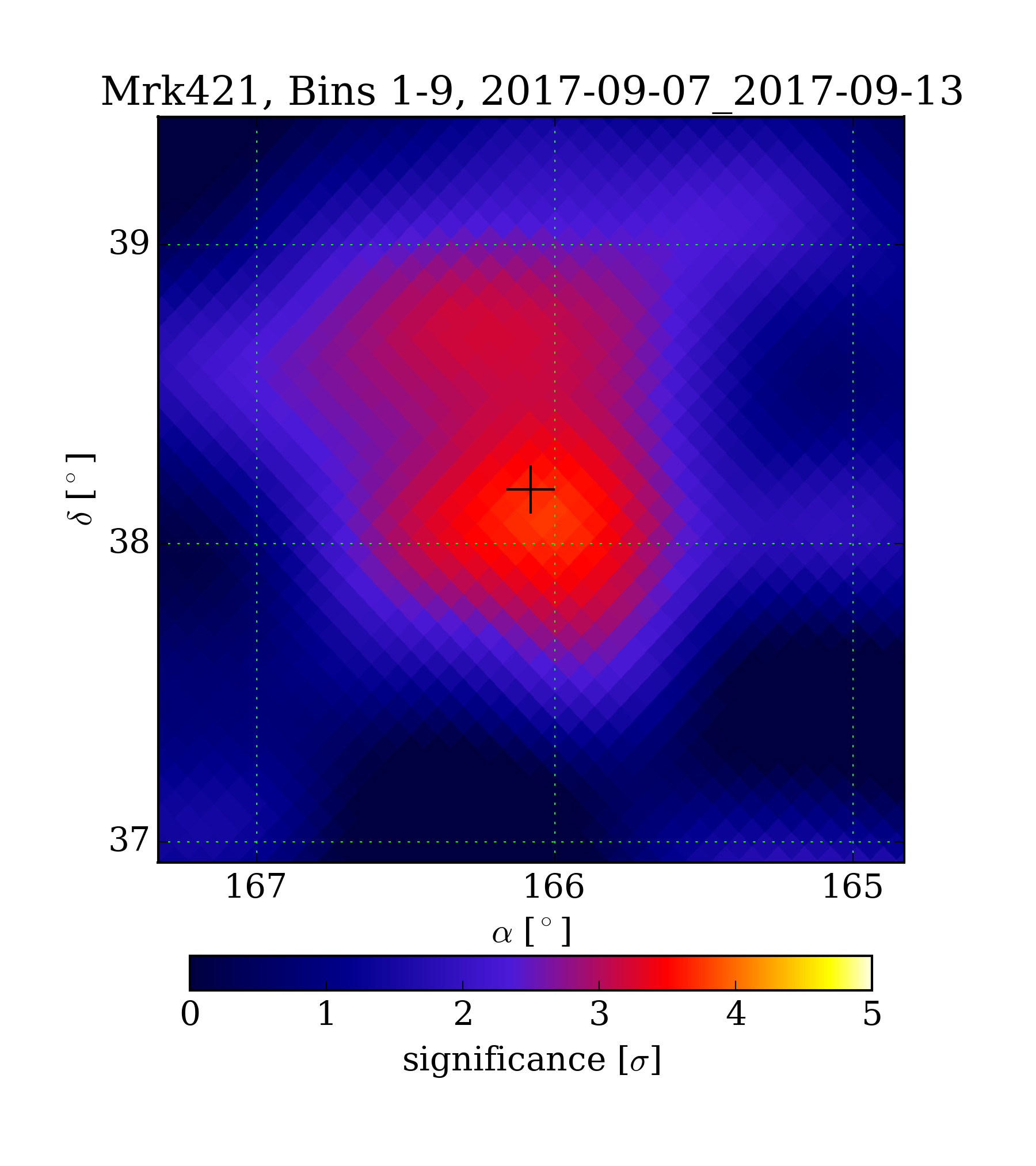 | Min: | -0.96 | (166.31 deg, 37.03 deg) | | Max: | 3.76 | (166.00 deg, 38.11 deg) | | Significance at Mrk421: | 3.63 | (at Mrk421) |