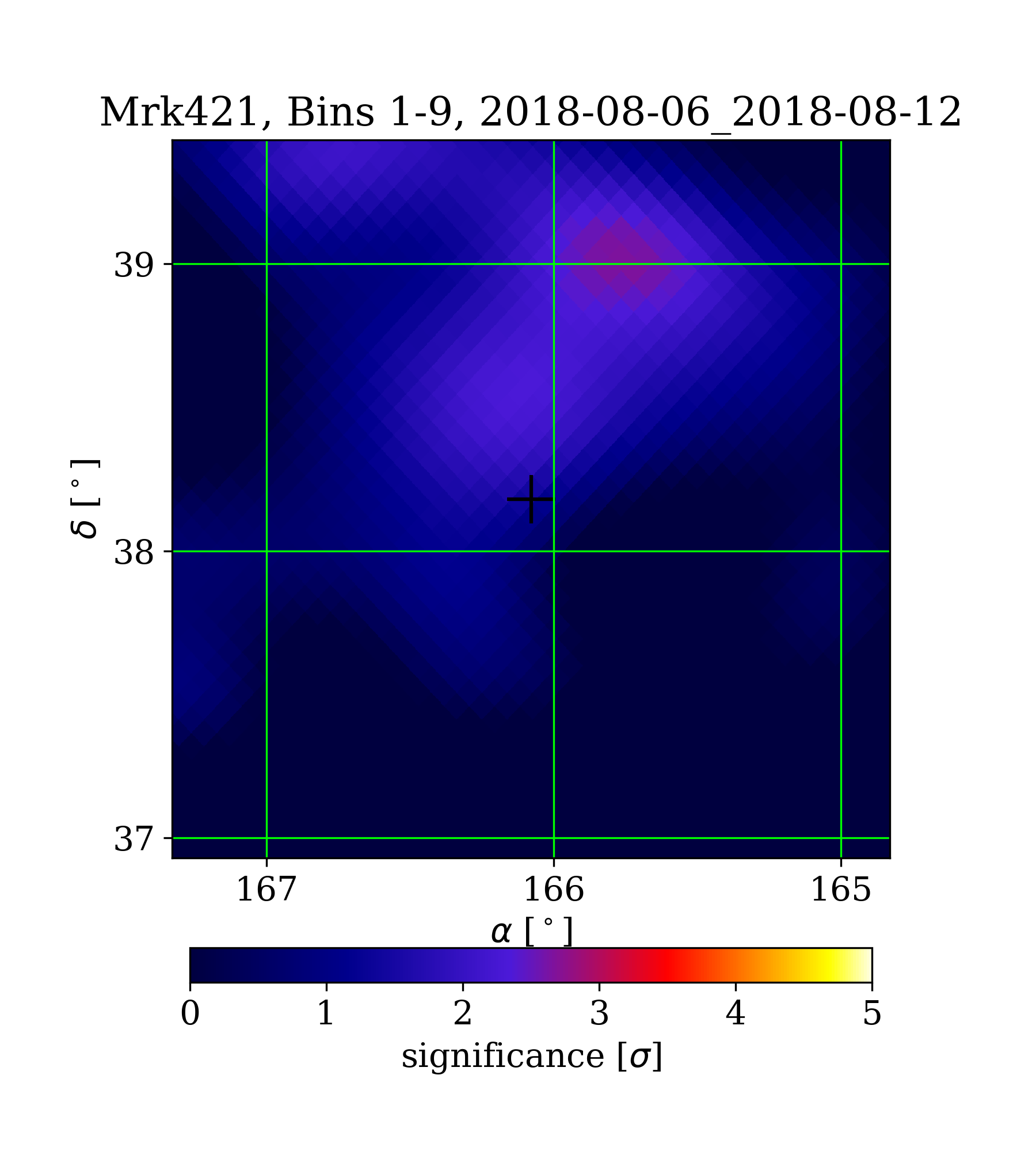 | Min: | -1.80 | (165.20 deg, 36.99 deg) | | Max: | 2.66 | (165.77 deg, 39.02 deg) | | Significance at Mrk421: | 1.45 | (at Mrk421) |