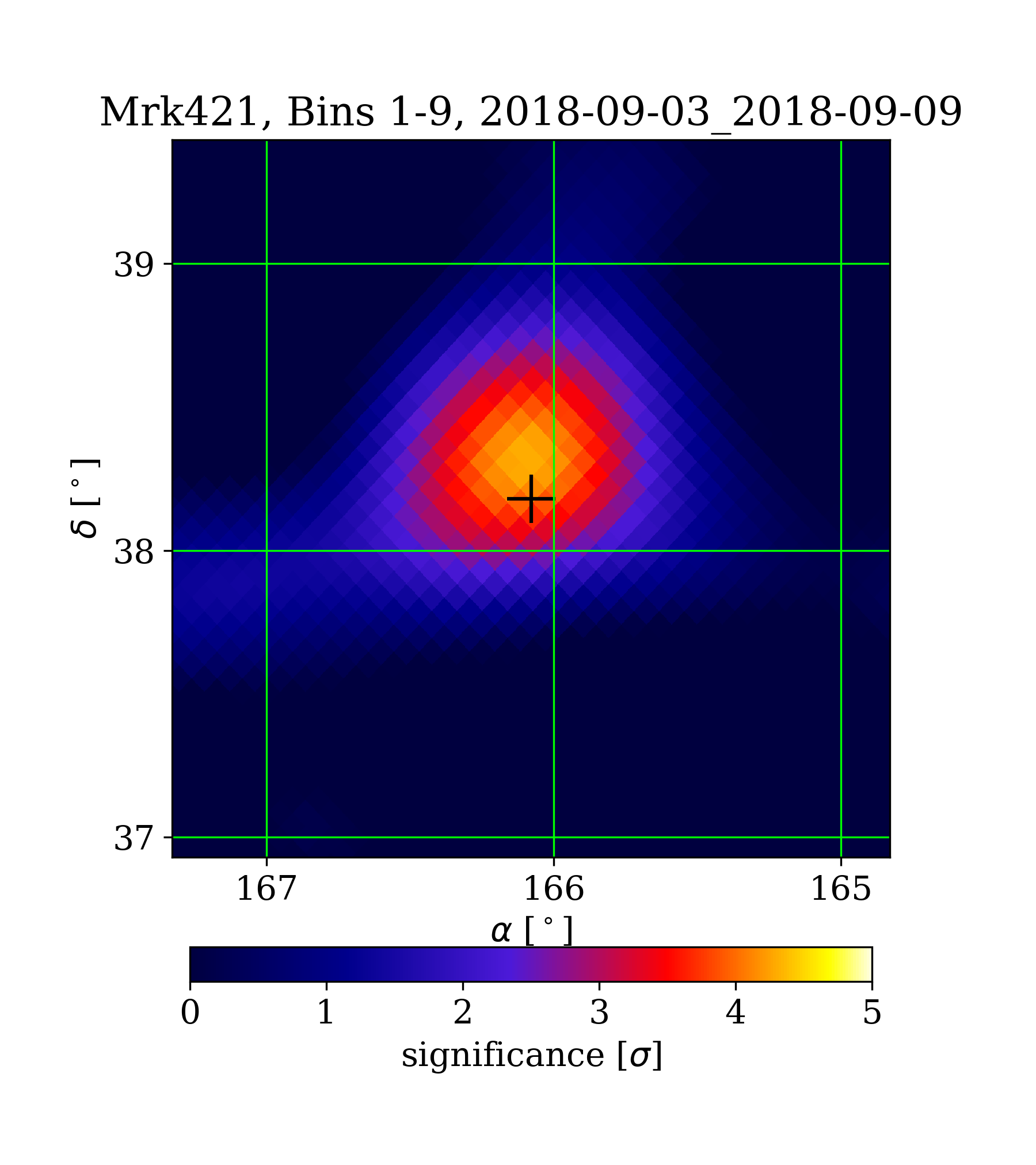 | Min: | -3.00 | (165.55 deg, 37.36 deg) | | Max: | 4.31 | (166.07 deg, 38.31 deg) | | Significance at Mrk421: | 4.14 | (at Mrk421) |
