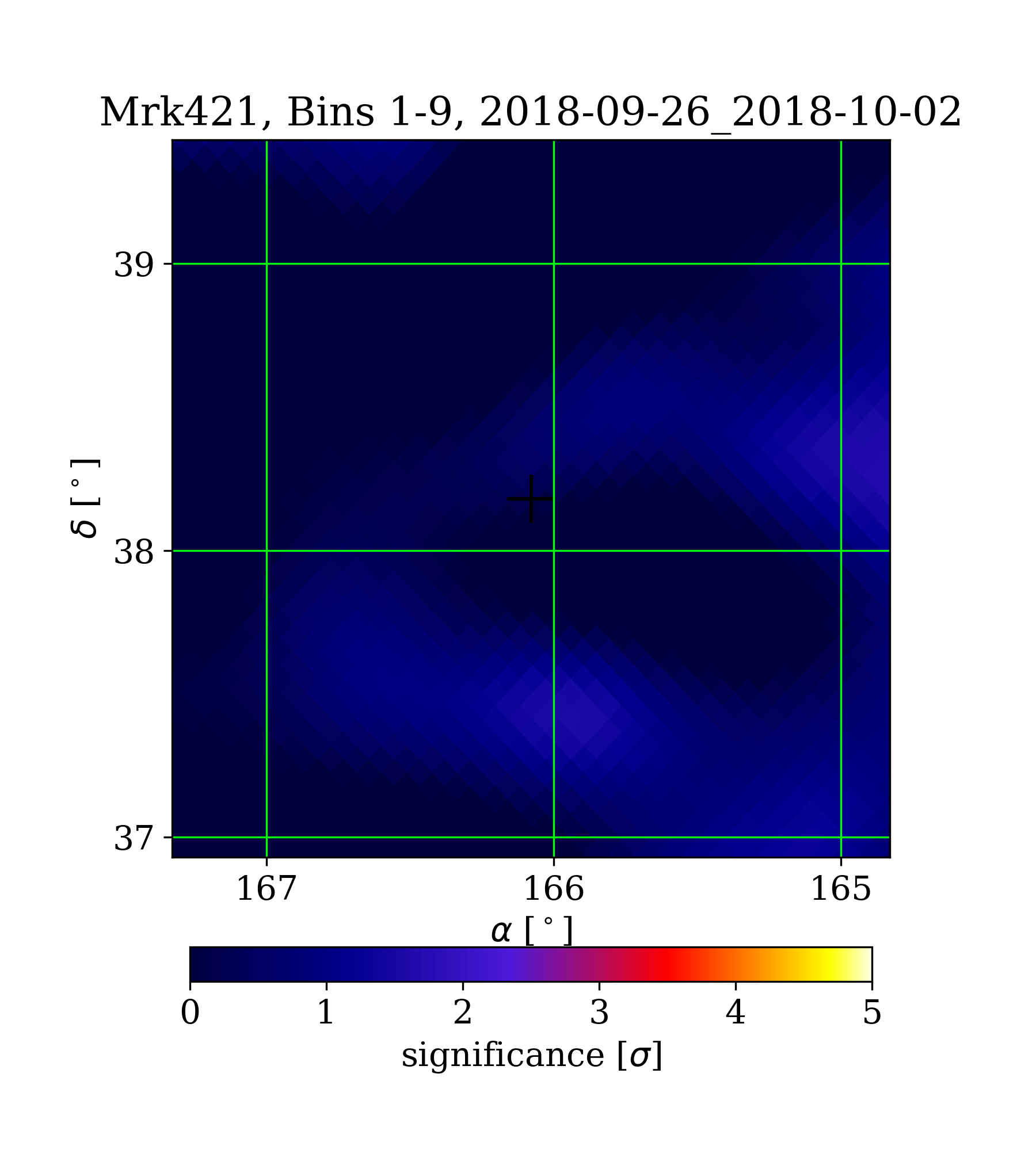 | Min: | -2.68 | (165.63 deg, 39.46 deg) | | Max: | 1.70 | (164.80 deg, 38.26 deg) | | Significance at Mrk421: | 0.33 | (at Mrk421) |