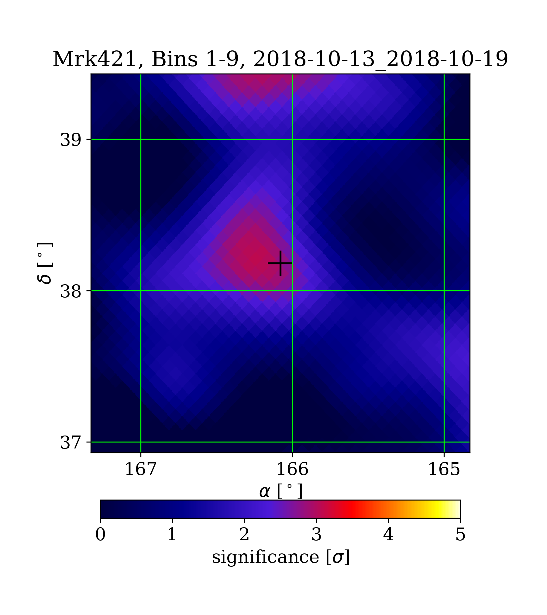 | Min: | 0.00 | (164.84 deg, 39.45 deg) | | Max: | 3.08 | (166.25 deg, 38.21 deg) | | Significance at Mrk421: | 2.83 | (at Mrk421) |