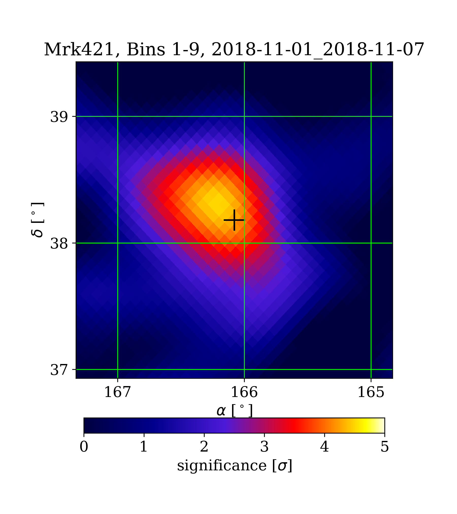 | Min: | 0.00 | (165.01 deg, 39.45 deg) | | Max: | 4.51 | (166.20 deg, 38.25 deg) | | Significance at Mrk421: | 4.28 | (at Mrk421) |