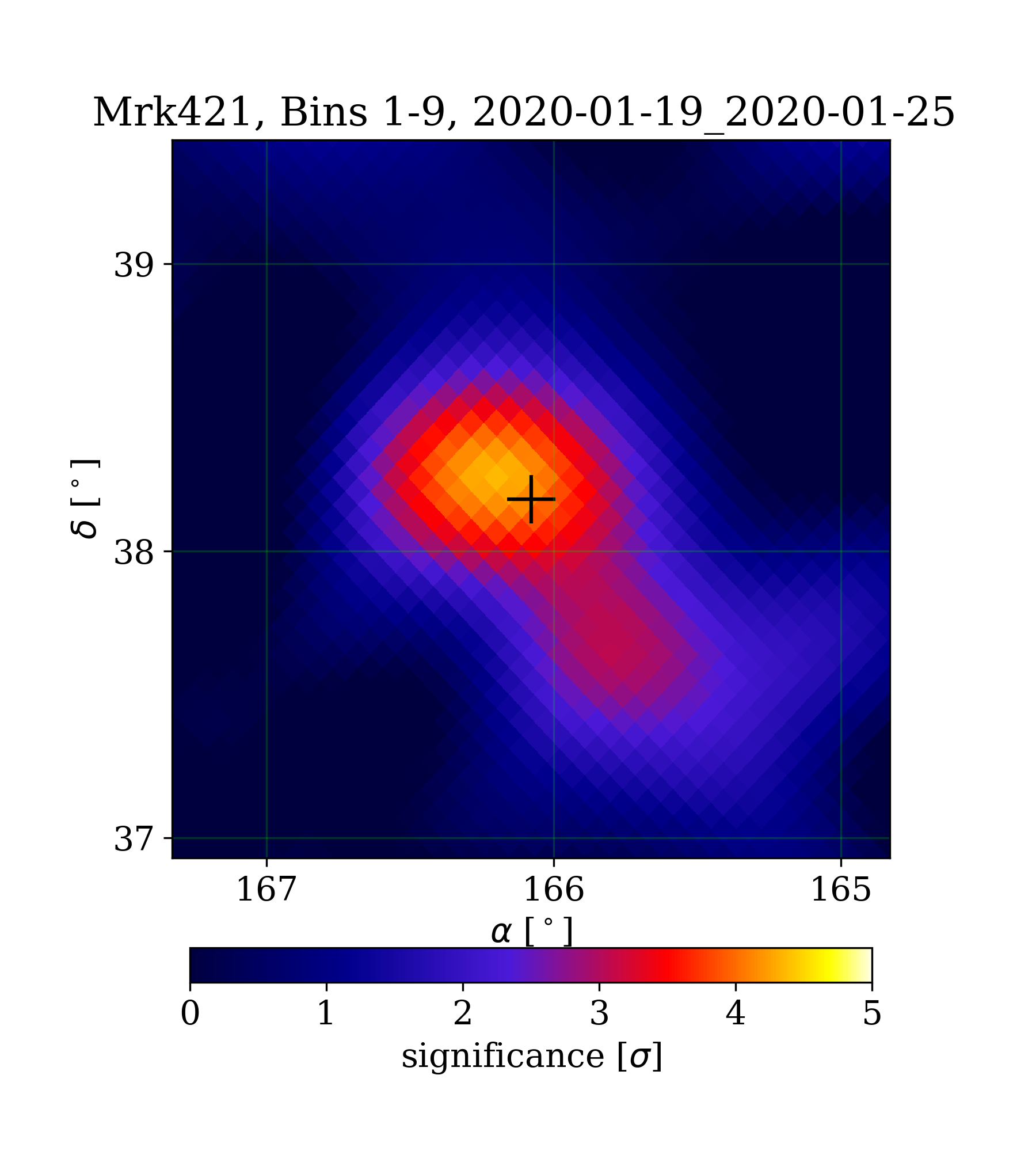 | Min: | -1.77 | (167.34 deg, 37.97 deg) | | Max: | 4.36 | (166.20 deg, 38.25 deg) | | Significance at Mrk421: | 4.13 | (at Mrk421) |