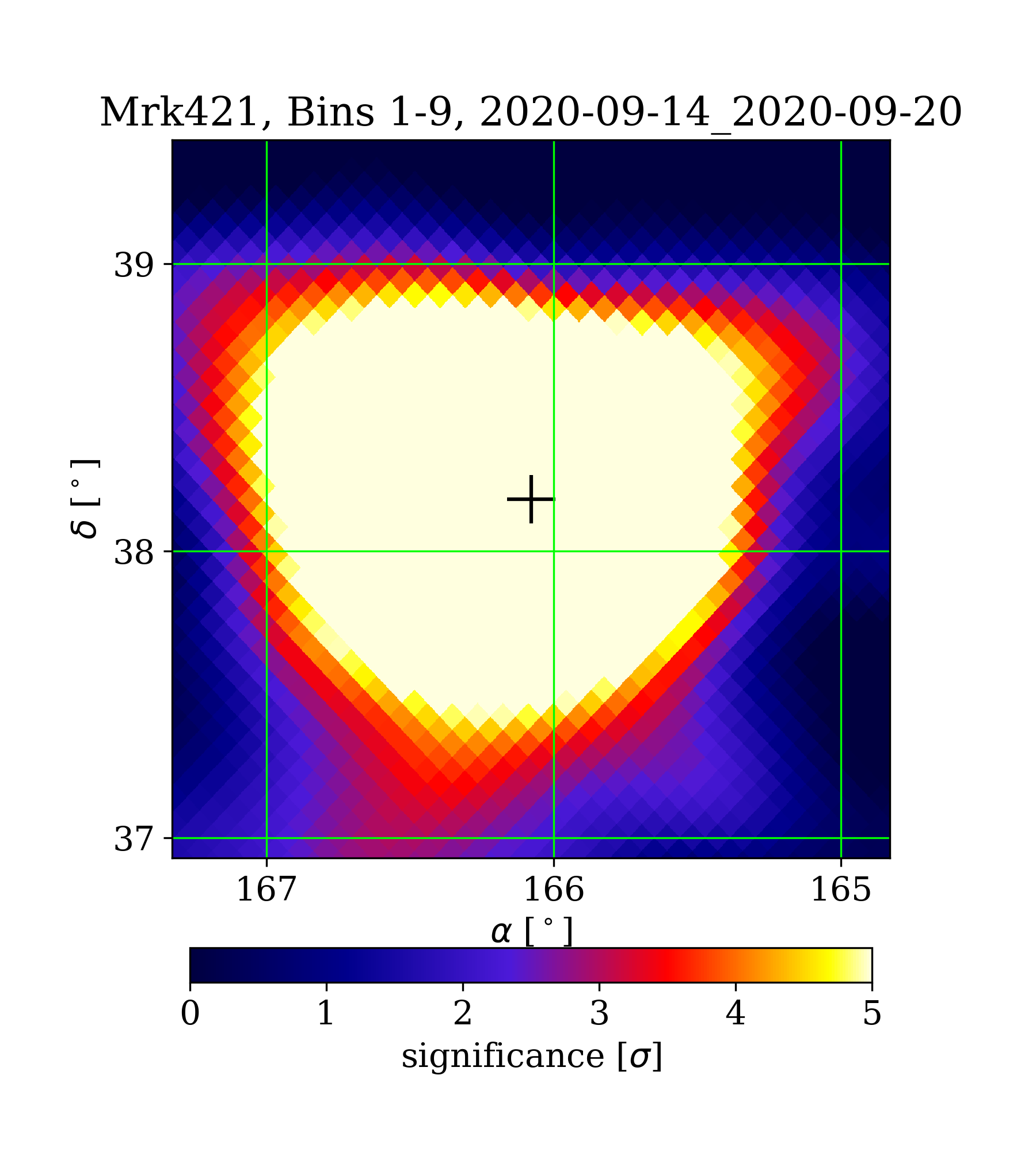 | Min: | -1.25 | (164.86 deg, 39.42 deg) | | Max: | 16.83 | (166.13 deg, 38.13 deg) | | Significance at Mrk421: | 16.66 | (at Mrk421) |
