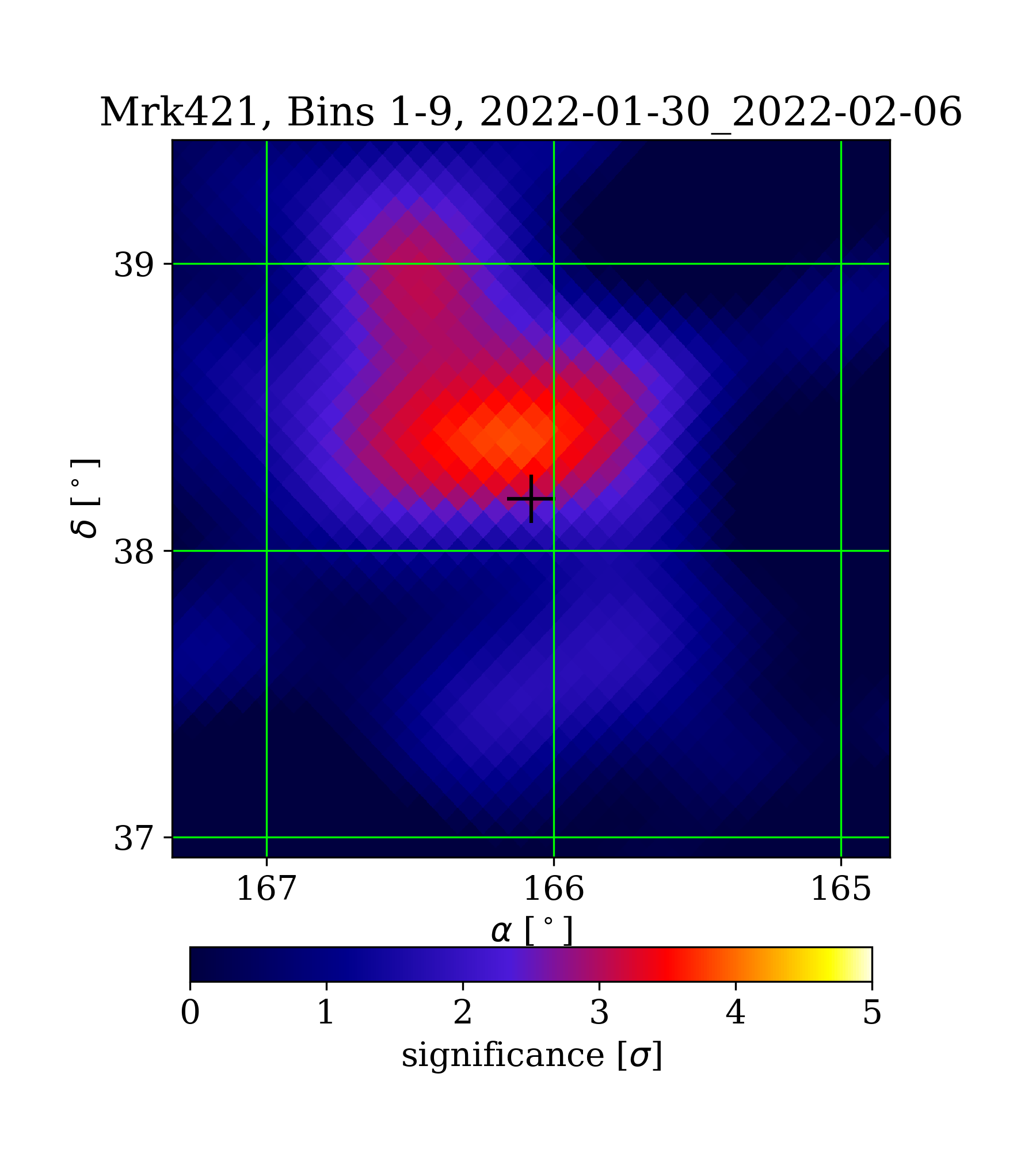 | Min: | -2.70 | (166.91 deg, 36.92 deg) | | Max: | 3.85 | (166.16 deg, 38.37 deg) | | Significance at Mrk421: | 2.83 | (at Mrk421) |