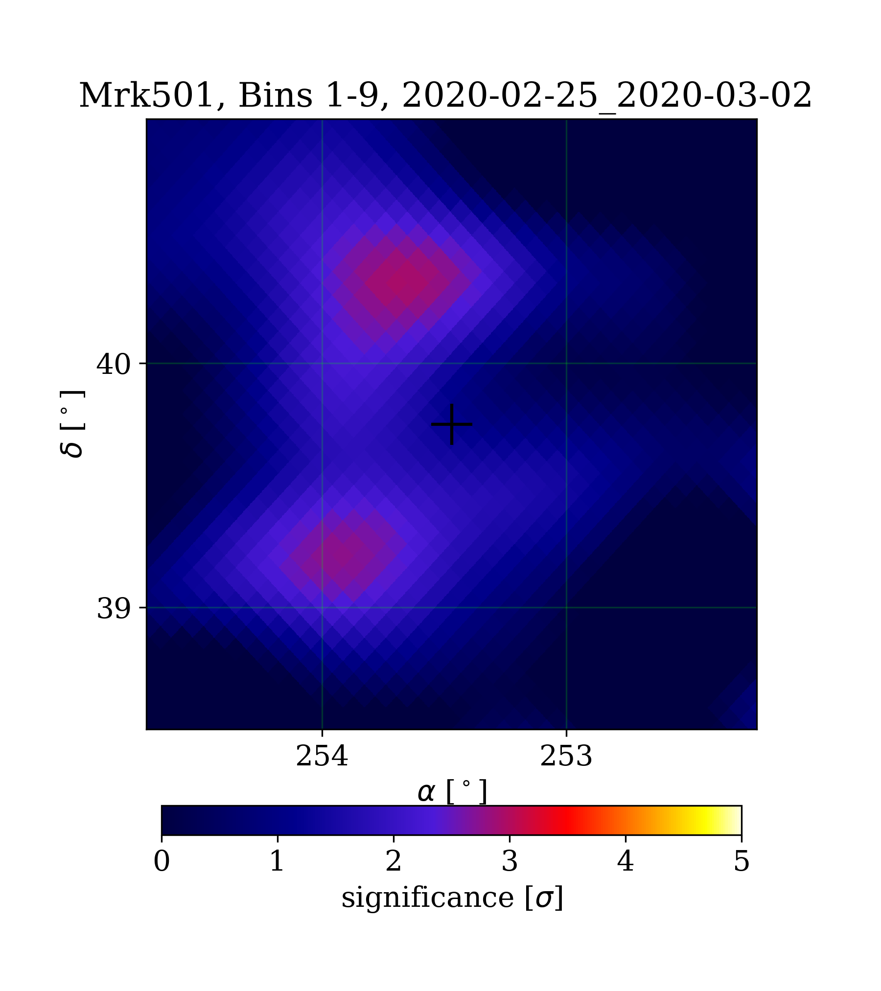 | Min: | -2.72 | (252.77 deg, 40.97 deg) | | Max: | 2.94 | (253.70 deg, 40.33 deg) | | Significance at Mrk501: | 1.16 | (at Mrk501) |
