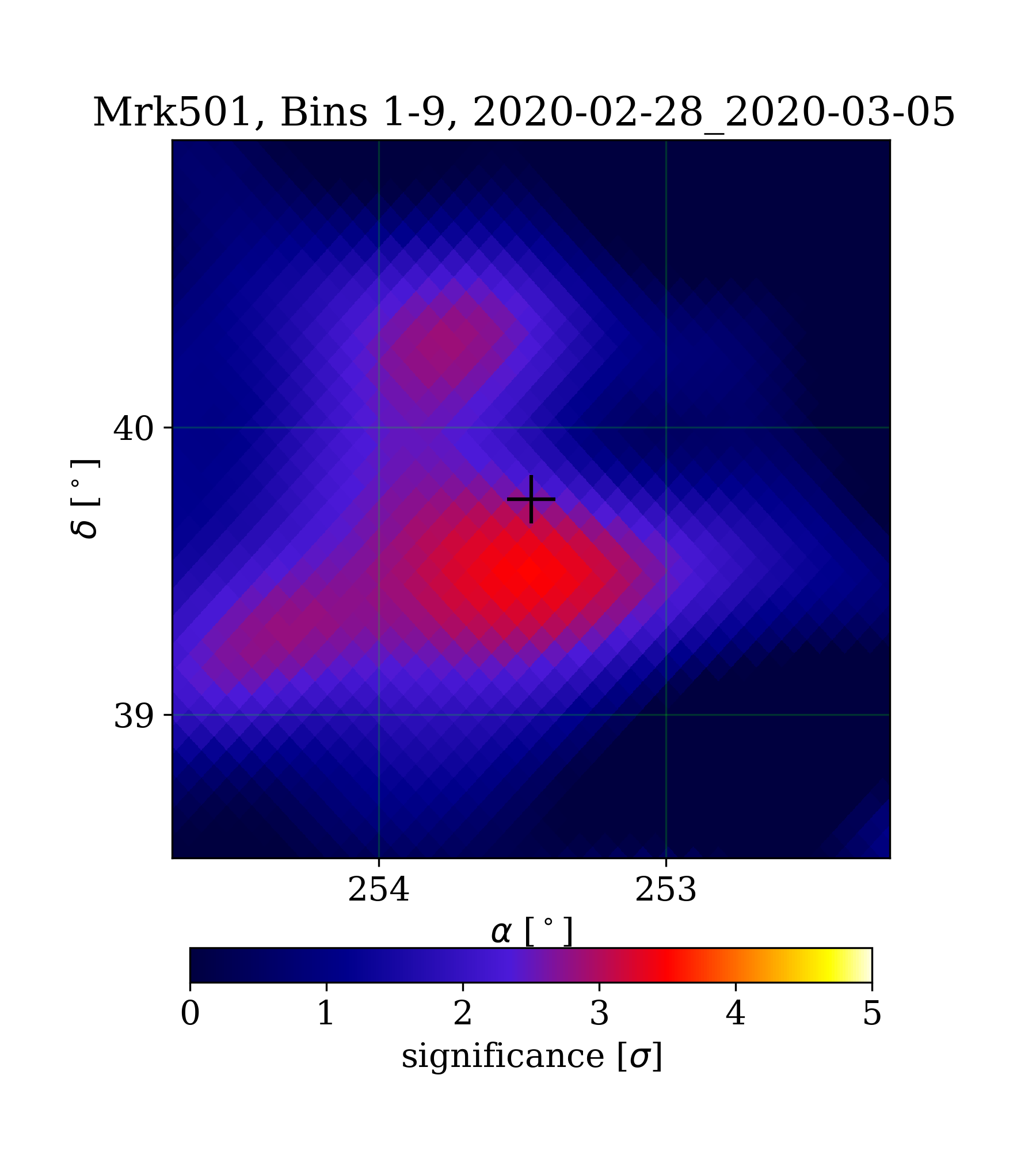 | Min: | -1.78 | (252.86 deg, 40.87 deg) | | Max: | 3.50 | (253.48 deg, 39.50 deg) | | Significance at Mrk501: | 2.44 | (at Mrk501) |