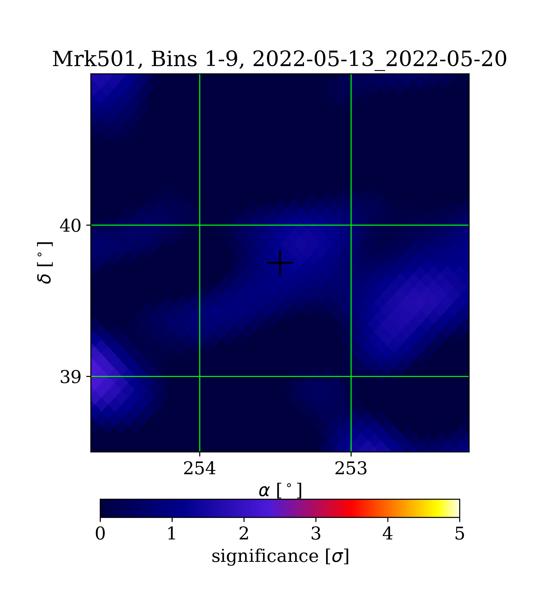 | Min: | -2.11 | (252.63 deg, 40.56 deg) | | Max: | 2.40 | (254.74 deg, 39.00 deg) | | Significance at Mrk501: | 1.16 | (at Mrk501) |